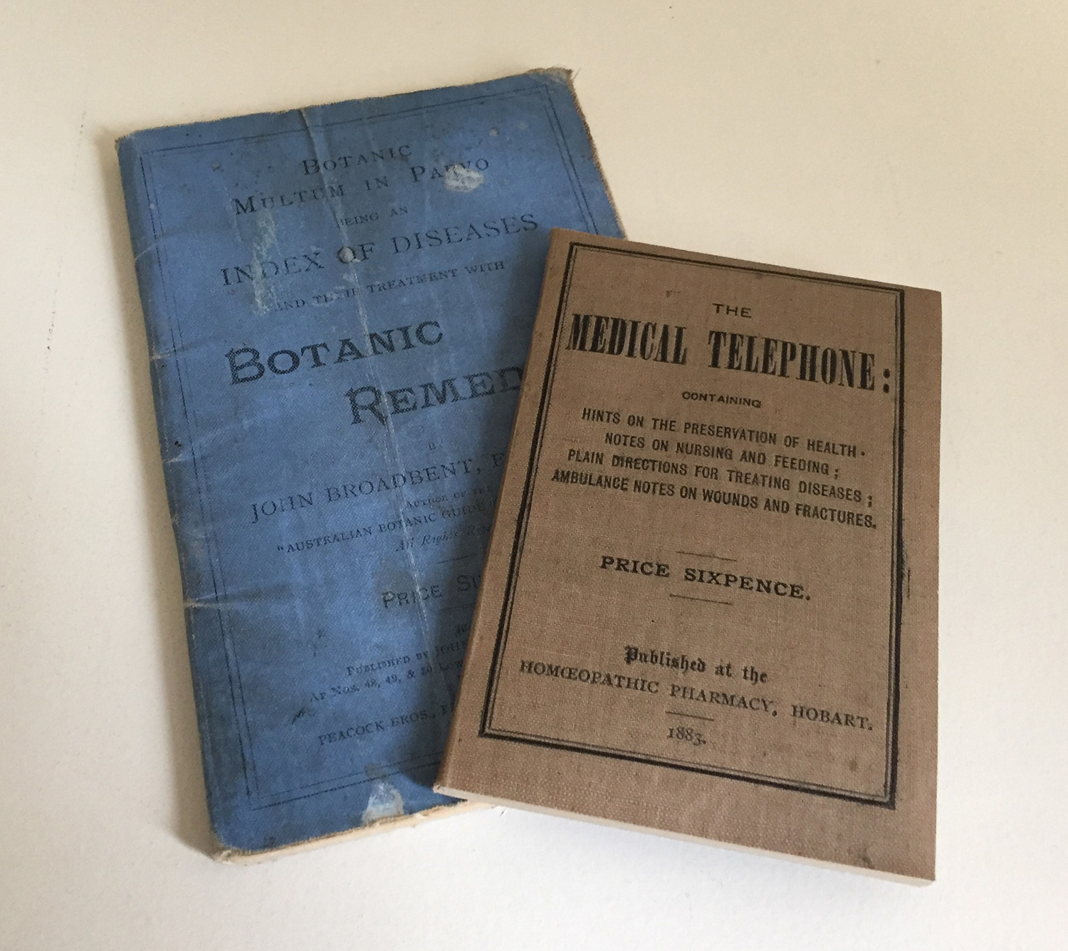 [AUSTRALIAN HOMŒOPATHY & BOTANICAL MEDICINE]: THE MEDICAL TELEPHONE. cr 16mo; printed cloth wrappers. Hobart: Homoeopathic Pharmacy, 1883. Scarce. + BOTANIC MULTUM IN PARVO. John Broadbent & Sons, 1895.