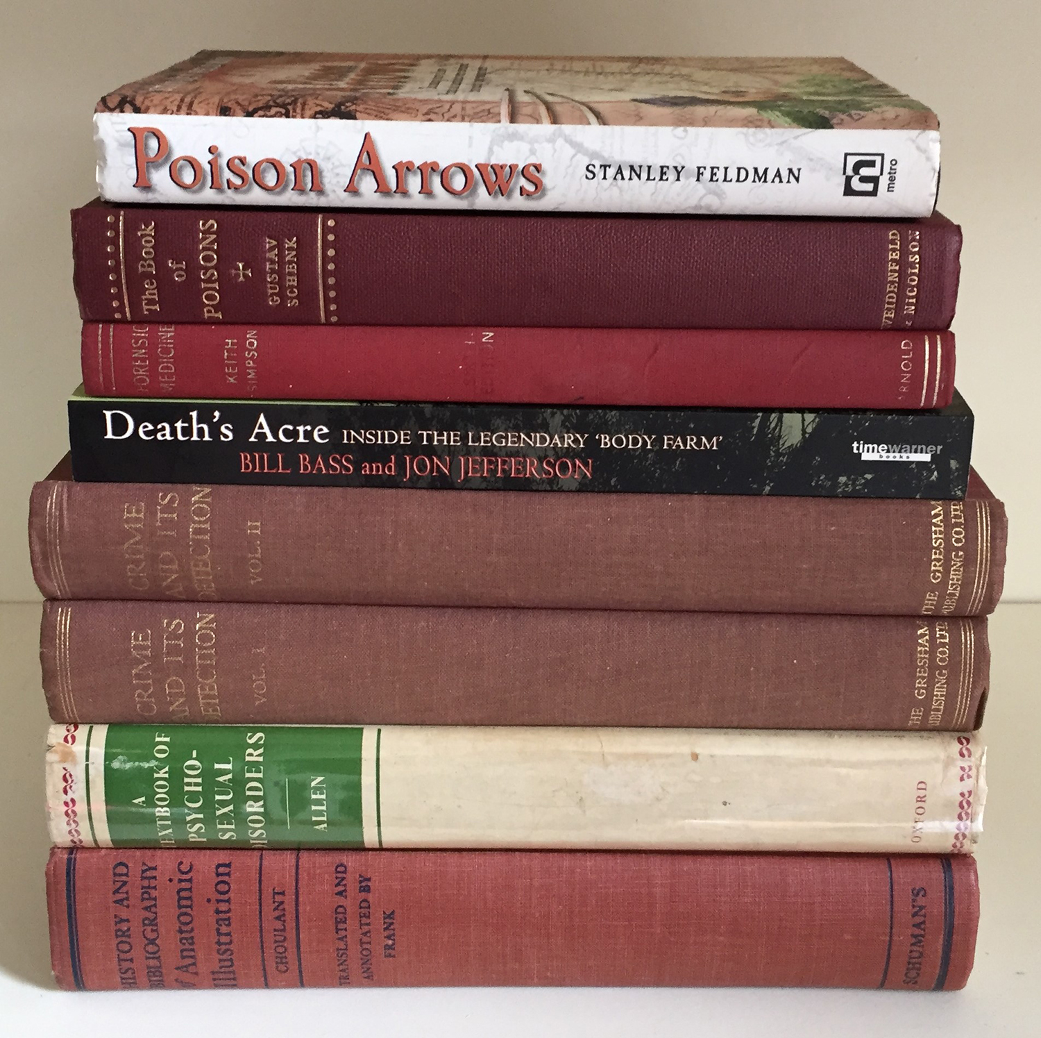 [POISONS, FORENSICS & MEDICINE]: A group of seven works about poisons, forensic science, &c., including HISTORY AND BIBLIOGRAPHY OF ANATOMIC ILLUSTRATION. Schuman's 1945. Revised edition. + A TEXTBOOK OF PSYCHOSEXUAL DISORDERS. Oxford University Press, 1962. First edition. + CRIME AND ITS DETECTION. Vols. I & II. Gresham Publishing Co., 1938.