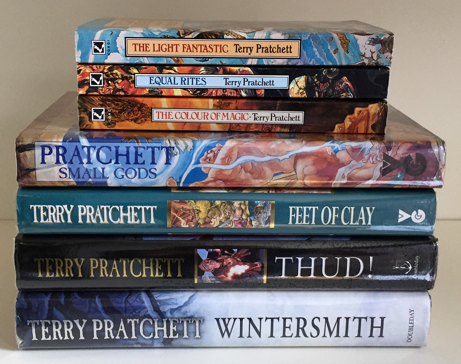 PRATCHETT, Terry: A very nice group of four signed Pratchett books: SMALL GODs. Victor Gollancz, 1992. First edition. + FEET OF CLAY. Victor Gollancz, 1996. First edition. + THUD! Doubleday, 2005. First edition. + WINTERSMITH. Doubleday, 2006. First Australian edition. + Three other Discworld stories in paperback.
