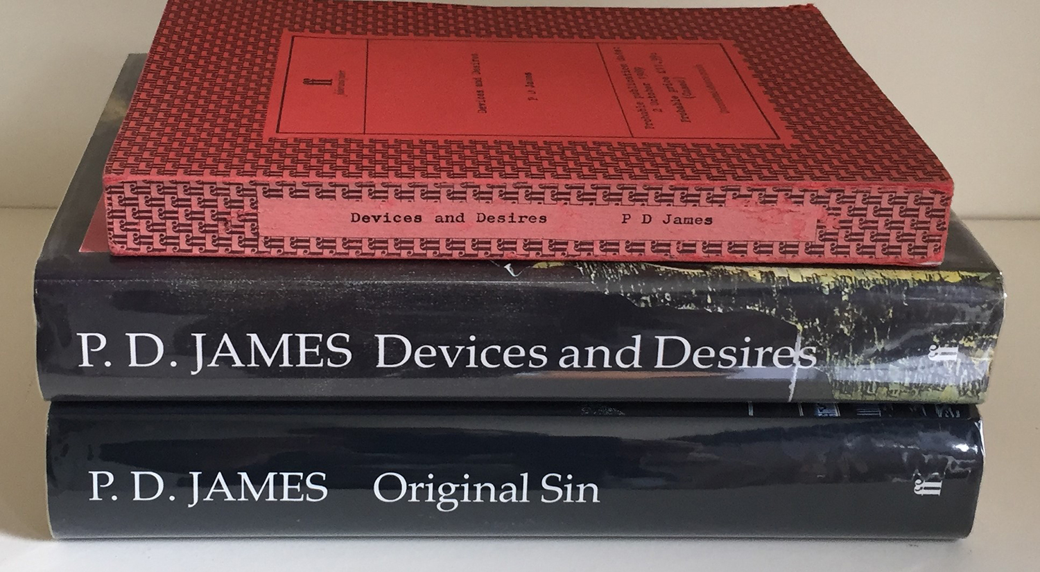 JAMES, P. D.: DEVICES AND DESIRES. Printed card wrappers. Faber, 1989. Uncorrected advance proof. + DEVICES AND DESIRES. Faber, 1989. First edition. + ORIGINAL SIN. Faber, 1994. First edition.