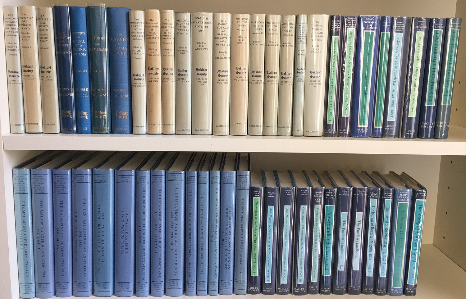 [HAKLUYT SOCIETY]: A large and excellent group of 58 volumes from the second and third series, including a complete set of : THE TRAVELS OF IBN BATTUTA. Vols I–V. Series II: Nos. 110, 117, 141, 178, 190. Hakluyt Society, 1958, 1962, 1971, 1994, 2000. + THE MALASPINA EXPEDITION 1789–1794. Vols I–III. Series III: Nos. 8, 11 & 13. Hakluyt Society, 2001–2004. + LA AUSTRIALIA DEL ESPÍRITU SANTO. Vols I & II. Nos. 126 & 127. Hakluyt Society, 1966.