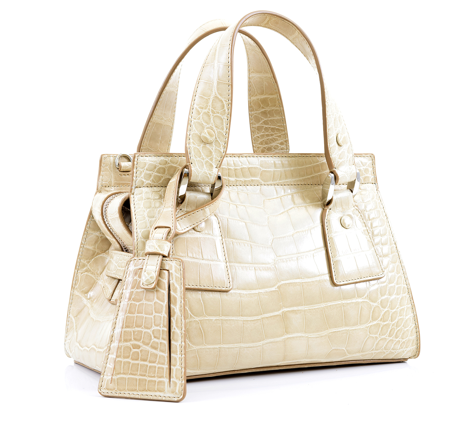 Styled in beige crocodile skin with silver metal hardware, 16 x 24.5 x 12.