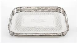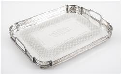 rounded rectangular in form with a pierced and beaded gallery edge, and raised on four bun feet. The centre bearing the inscription "PRESENTED TO SIR WILLIAM & LADY CLARKE, as a tribute of friendship & esteem, BY THE ENGLISH CRICKETERS IN AUSTRALIA 1882-1883" & with engraved facsimile signatures of eight English cricketers - Ivo Bligh, E.F.S.Tyldesley, C.F.M.Leslie, George Vernon, Charles Studd, George Studd, Walter Read & Allan Steel. Approximately 1494gms silver, 5cm high, 37cm wide, 28.5cm deep
