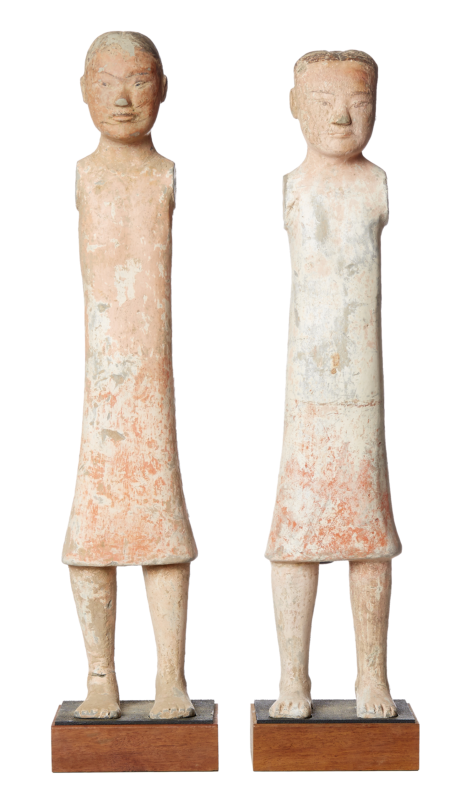 The figures with finely modelled faces, in earthenware painted with mineral pigments. Fitted wooden stands.
