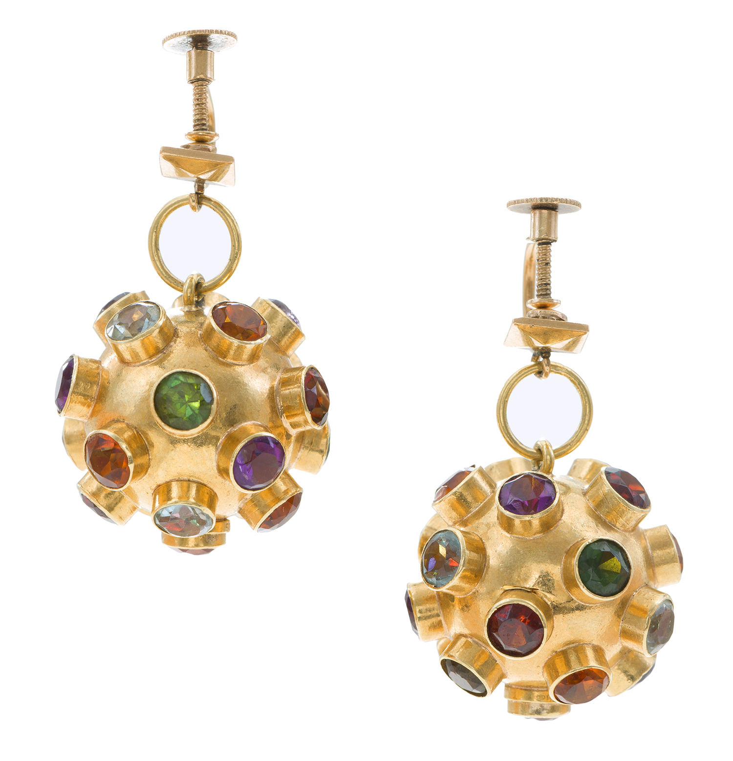 The sputnik style earrings, comprising multi-coloured faceted gemstones including aquamarine, amethyst, and citrine, mounted in gold to screwback fittings.