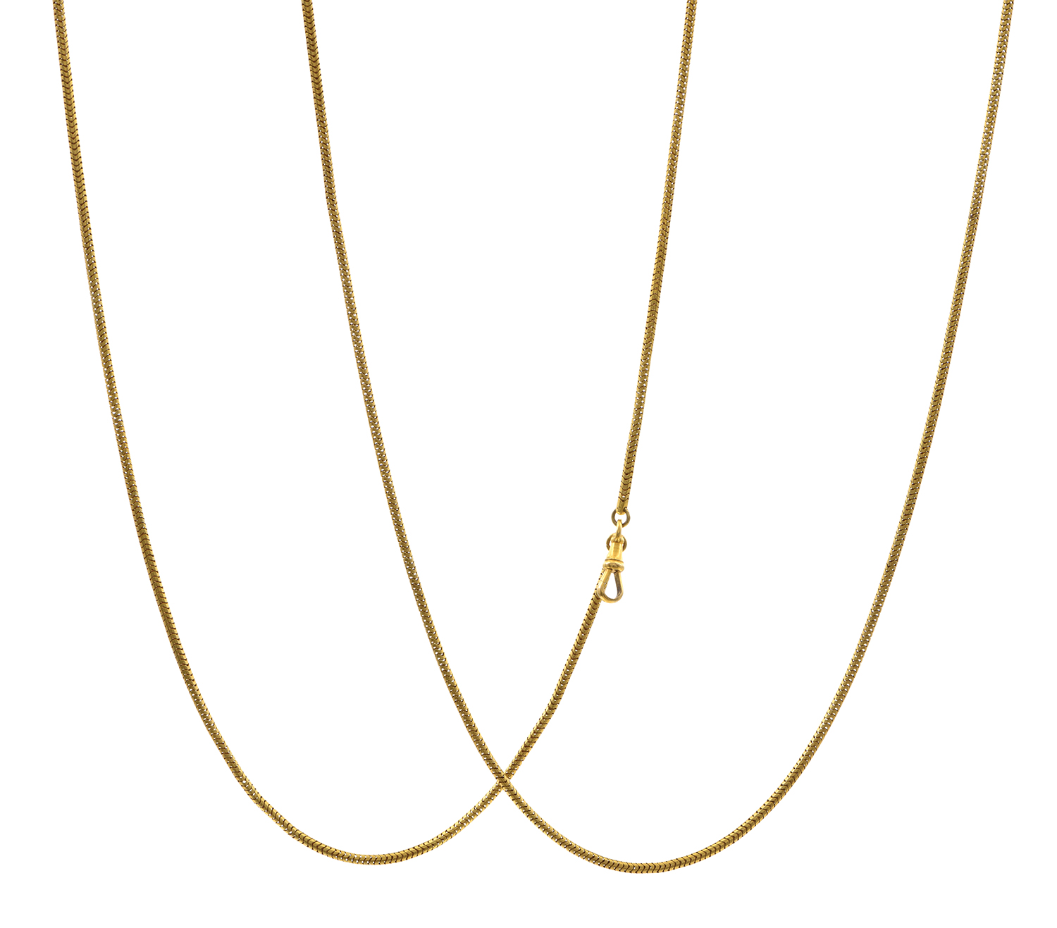 The gold snake link chain with swivel clasp, crafted in 18ct gold, total length 1500mm.