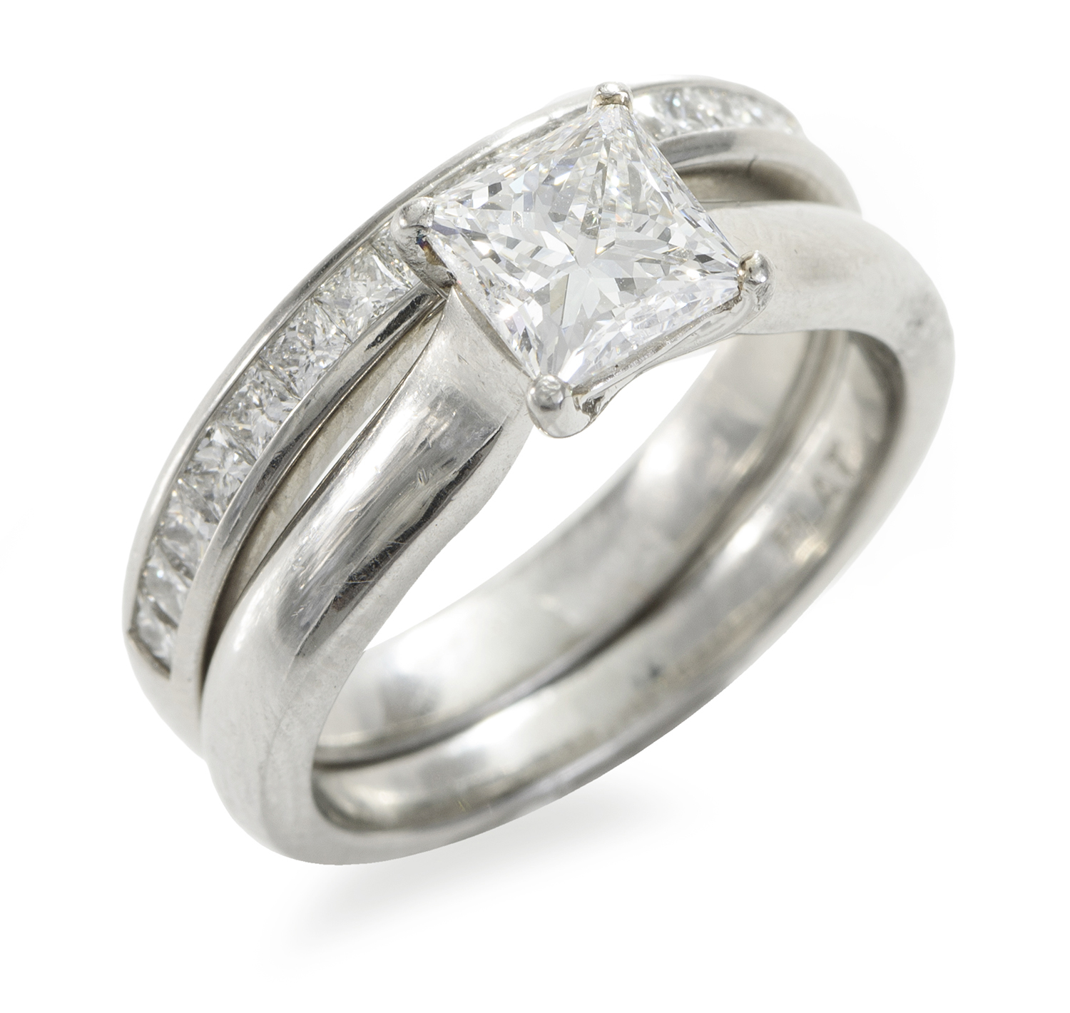 Comprising a square modified brilliant cut diamond of 1.02cts, accompanied by a princess cut diamond half hoop band totalling 0.25cts, both mounted in platinum, ring sizes K, accompanied by GIA diamond report number 1109681665 stating colour E and clarity VS1.