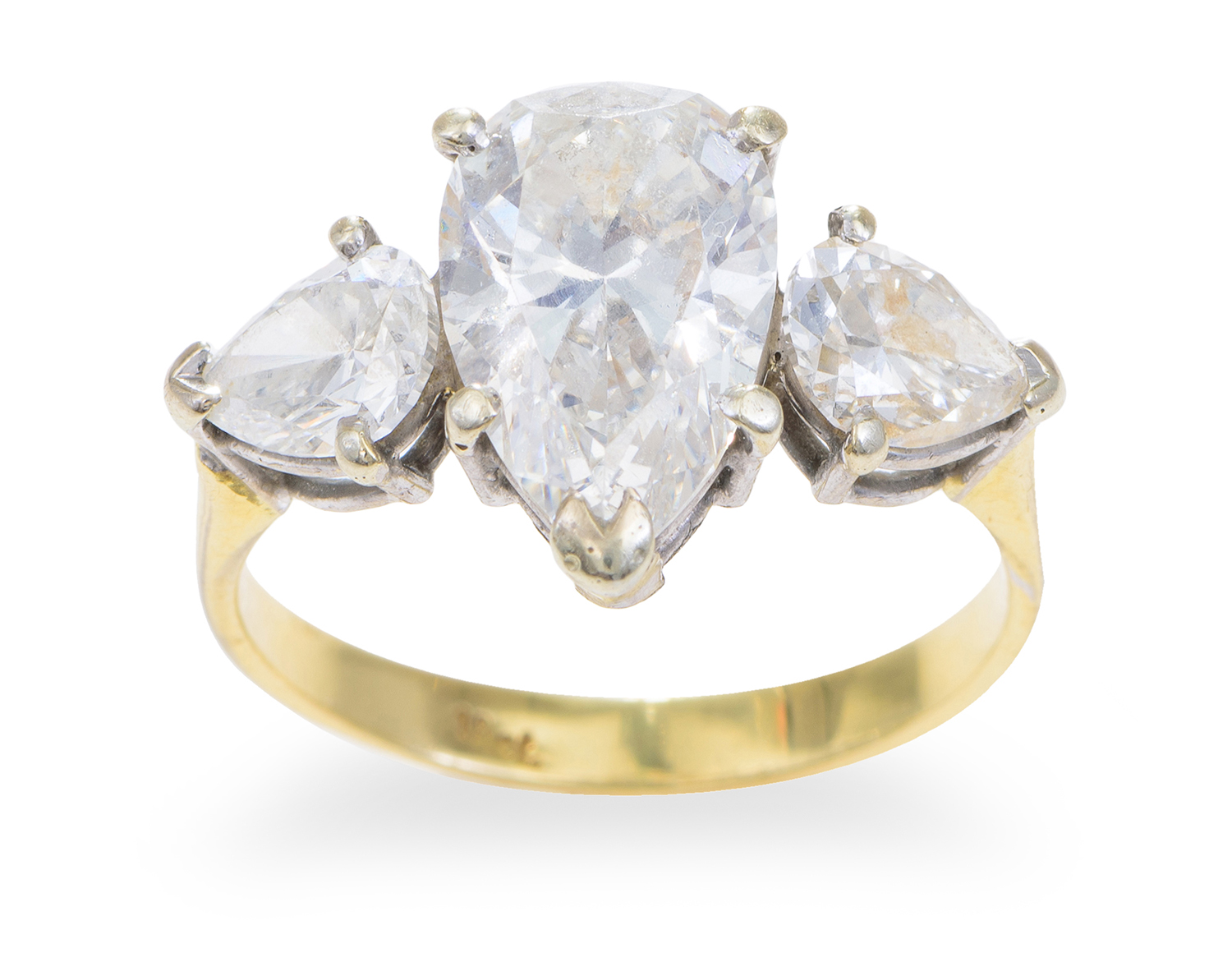Centrally set with a pear faceted diamond of 2.38cts, flanked by further horizontally set pear faceted diamonds totalling 1.12cts, mounted in 18ct gold, size M.