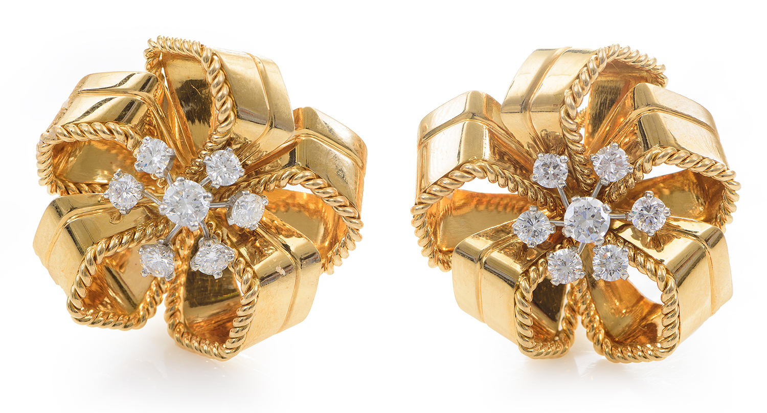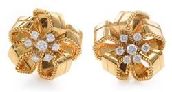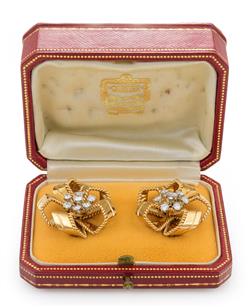 Of geometric cluster design, each set with a raised cluster of round brilliant cut diamonds totalling 0.80cts, mounted in 18ct gold to clip fittings, clip signed Cartier, London K3526, boxed.