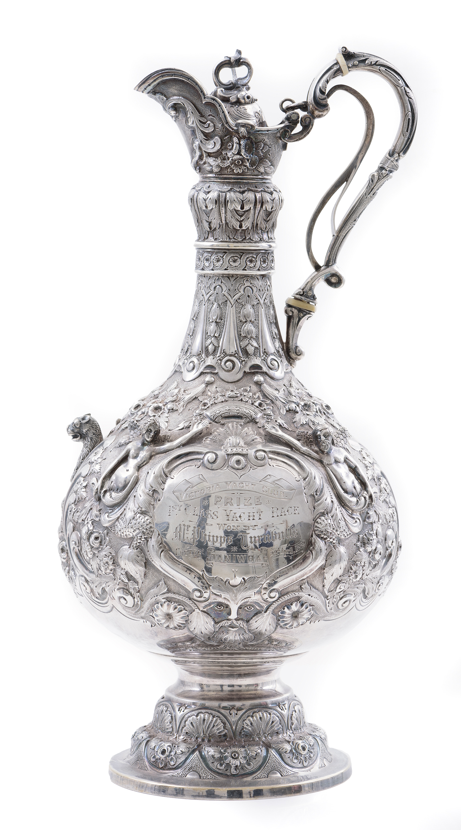 inscribed 'VICTORIA YACHT CLUB/ PRIZE / 1ST PRIZE YACHT RACE WON BY Mr Phipps Turnbulls / CUTTER/ TANIWHA / 29th April, 1882', approximately 1282 gms silver, 36.5cm high
