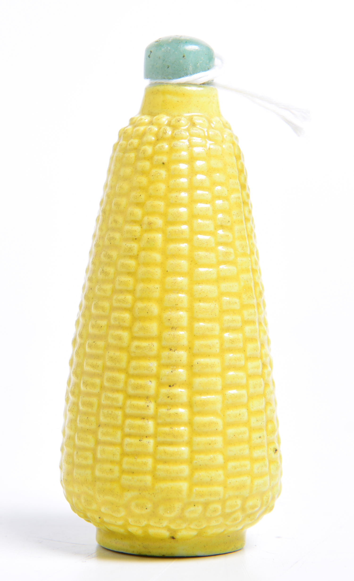 naturalistically moulded as a corn cob and covered in a rich yellow glaze, surmounted by a green stone lid joining to a bone spoon, 7.5cm high, 3.5cm at widest point