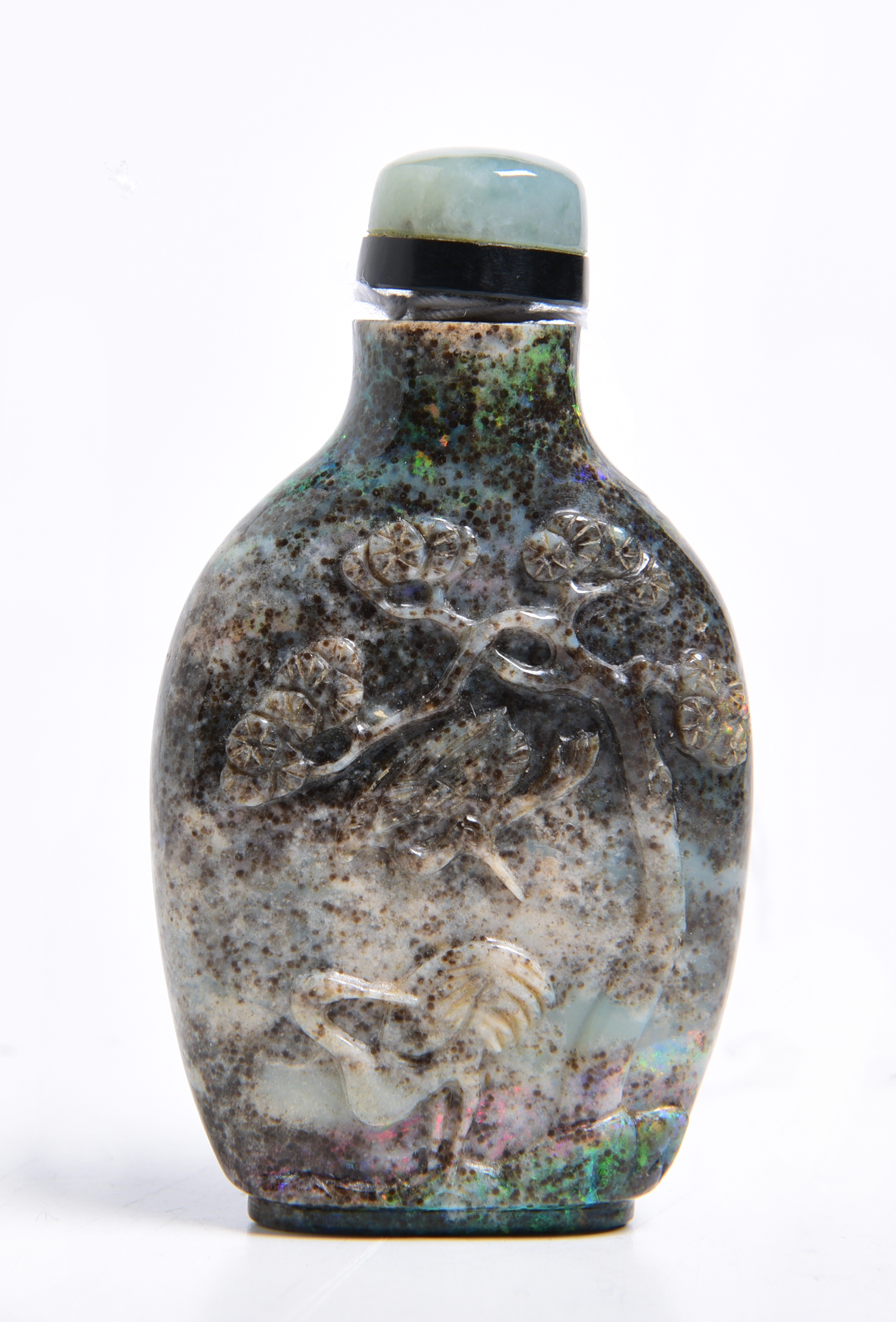 of typical from, carved to one side with two cranes under a prunus tree, surmounted by a green stone stopper with a stained bone spoon, 6cm high, 3.5cm at widest point