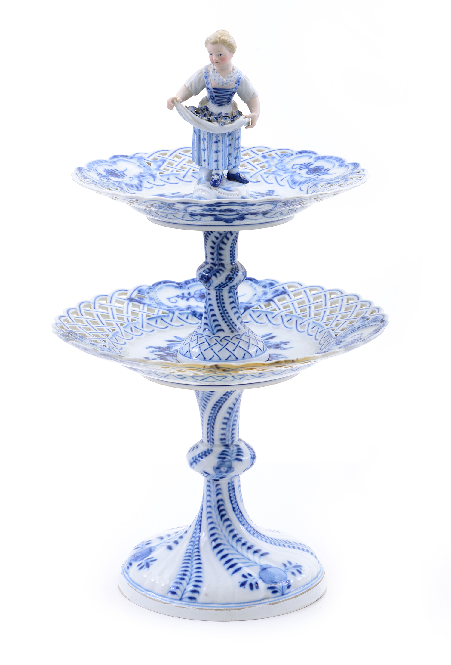 in a classic blue and white palette, the central knopped stem supporting two tiers above a figural finial, 40cm high