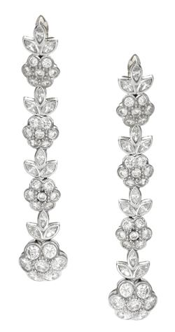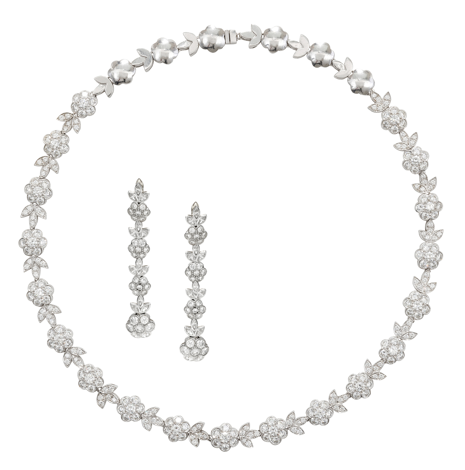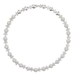 Of flower cluster and foliate design, comprising two hundred and forty seven round brilliant cut diamonds totalling 12.65cts, mounted in 18ct gold, total length 420mm, together with a pair of cubic zirconia drop earrings of a similar design.
