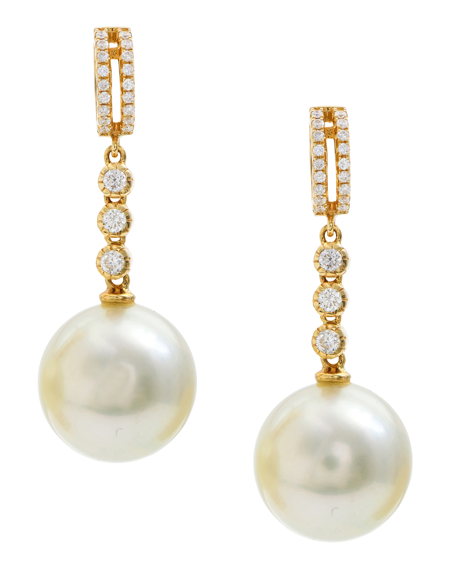 Each comprising a round pearl of cream and white hue measuring 13.1mm, suspended from an articulated diamond set bale in 18ct gold.