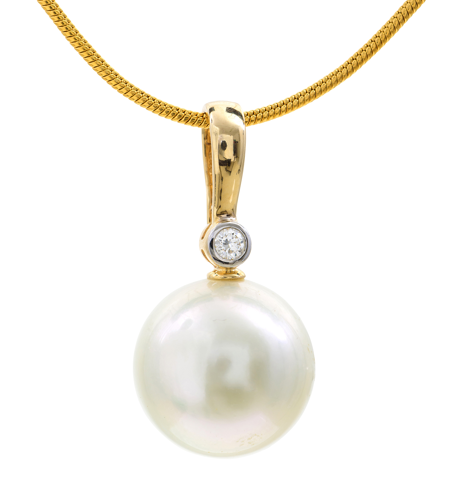 The round pearl measuring 14.8mm, surmounted by a diamond set enhancer bale in 14ct gold.