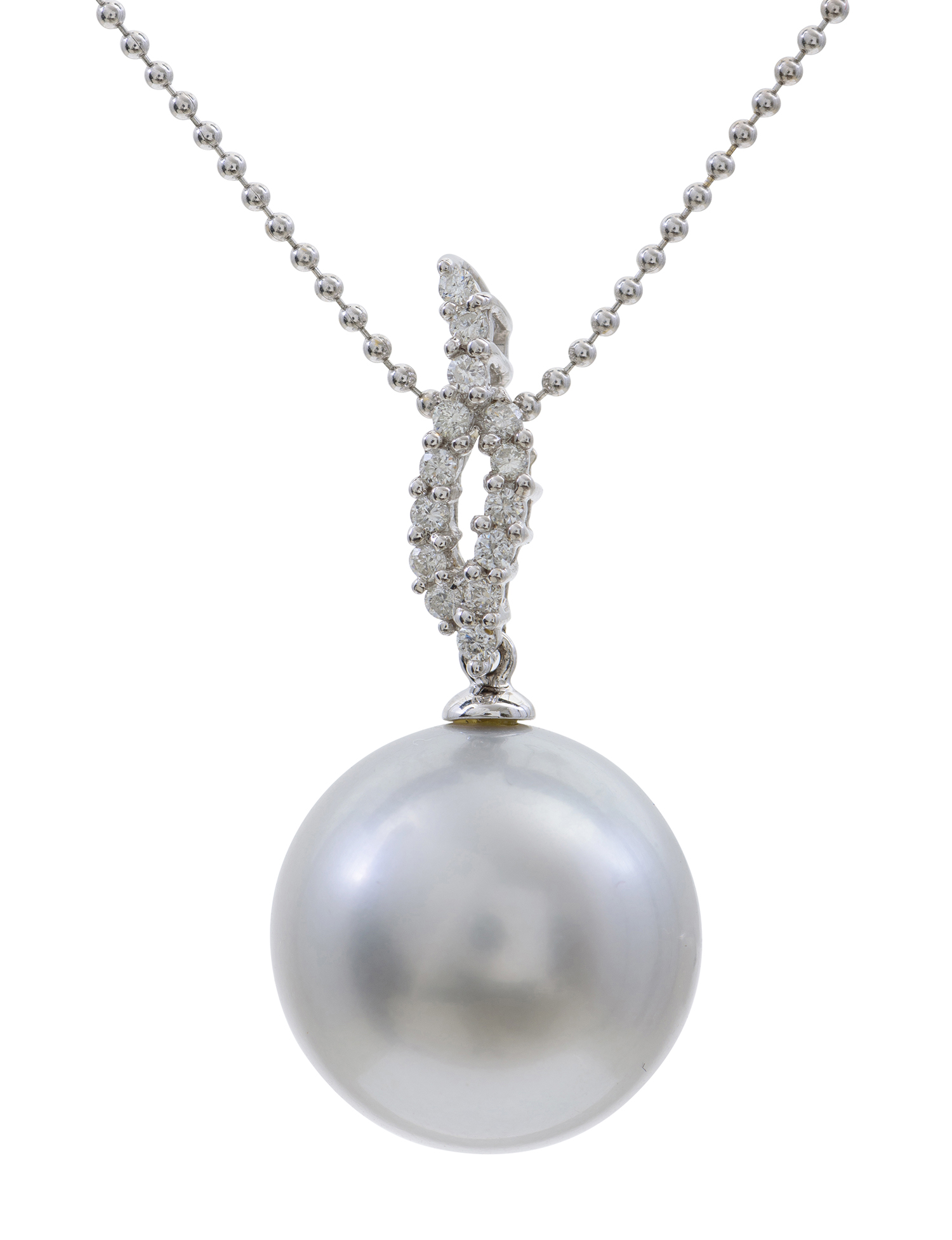 The round pearl of silver and grey hue measuring 14.7mm, suspended from a diamond set bale in 18ct white gold.