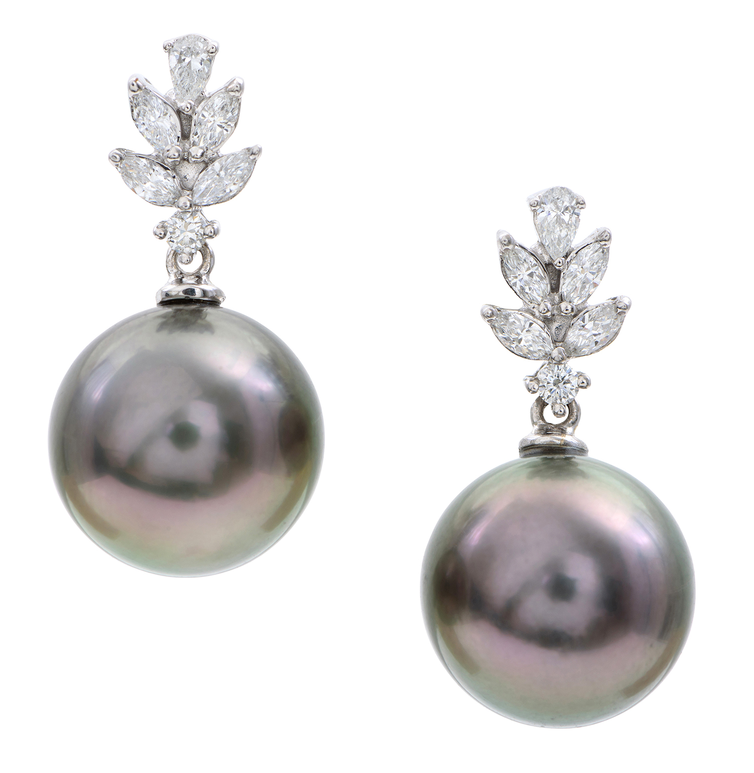 The earrings present in overall excellent condition. All stones are secure in the setting. The Tahitian pearls display very good lustre and are blemish free. To post and butterfly fittings.