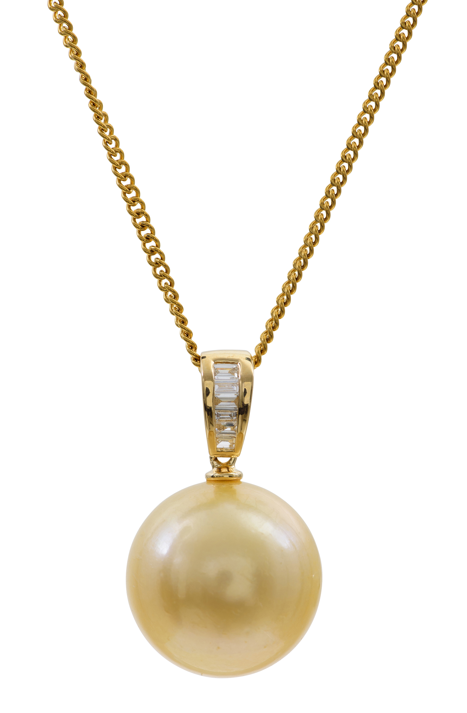 Comprising a round golden pearl measuring 15mm suspended from a diamond set bale, mounted in 18ct gold.