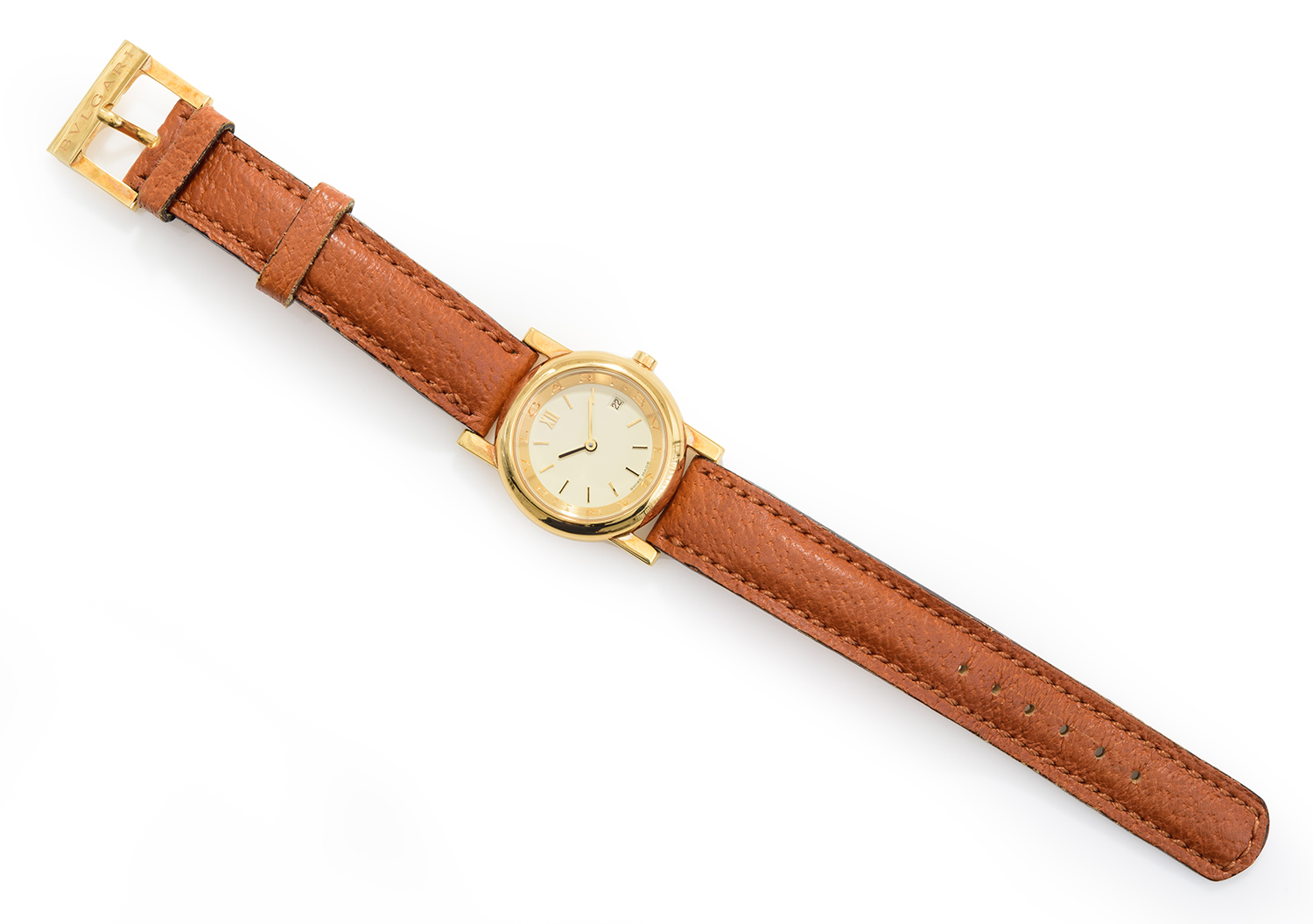 Quartz movement, circular cream dial with baton numerals, date apperture at three, signed case, dial and movement, 18ct gold case and tan leather bands, case reference AT 26 GL / 1656F, 20mm diameter.