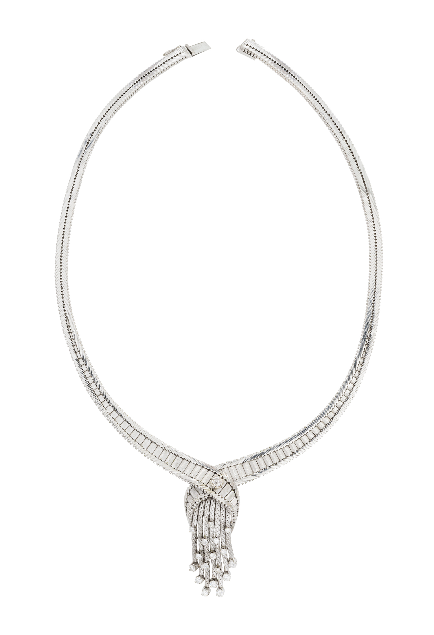 The central feature tassel set with round brilliant cut diamonds, surmounted by an old European cut diamond, all totalling 1.00ct, to an intergral collar crafted in white gold, total length 450mm.