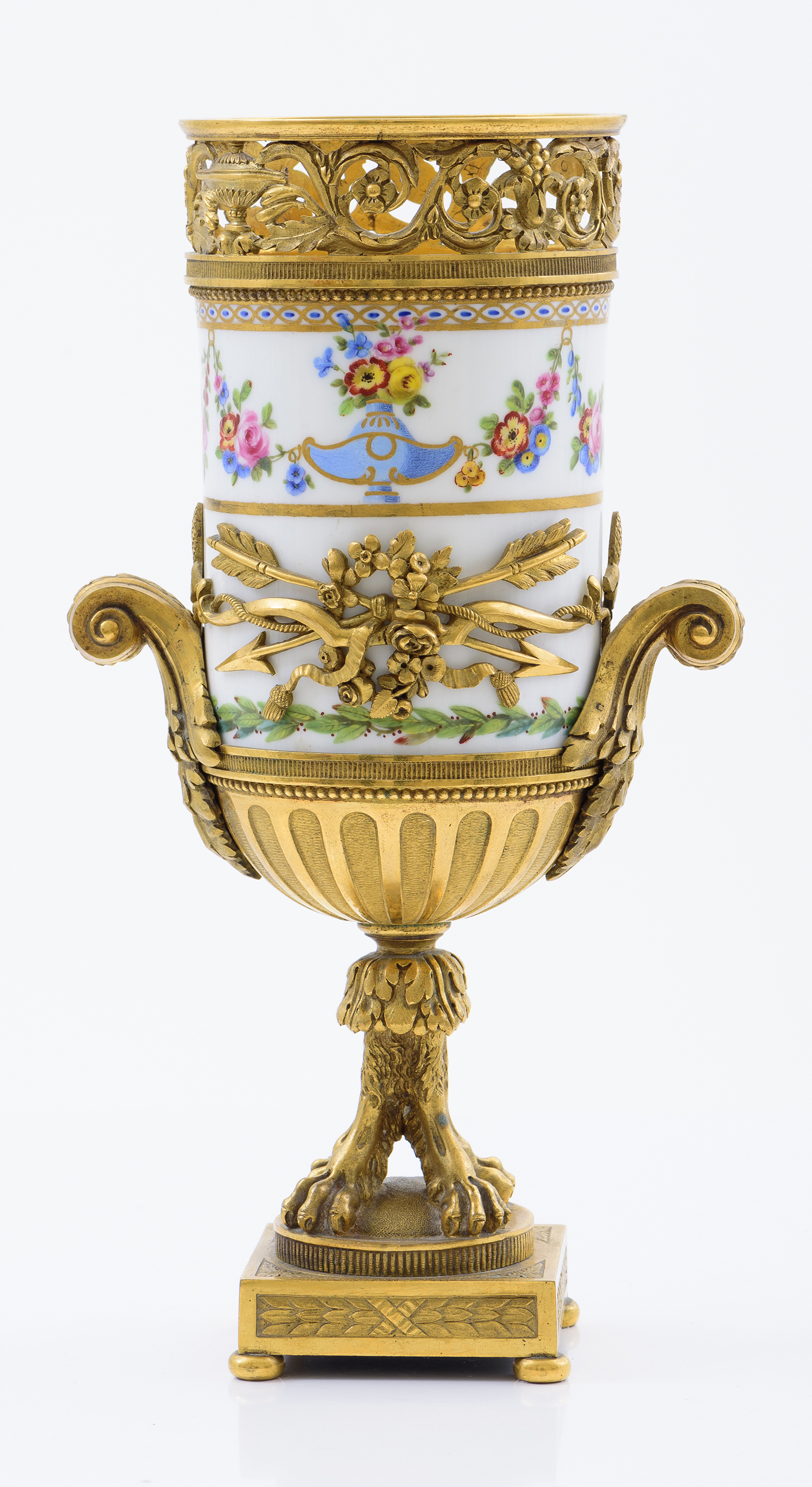 the whole finely cast with with an applied trophy to body flanked by two scroll handles above a four paw stem and a square pedestal base, 25cm high, and 9cm diameter