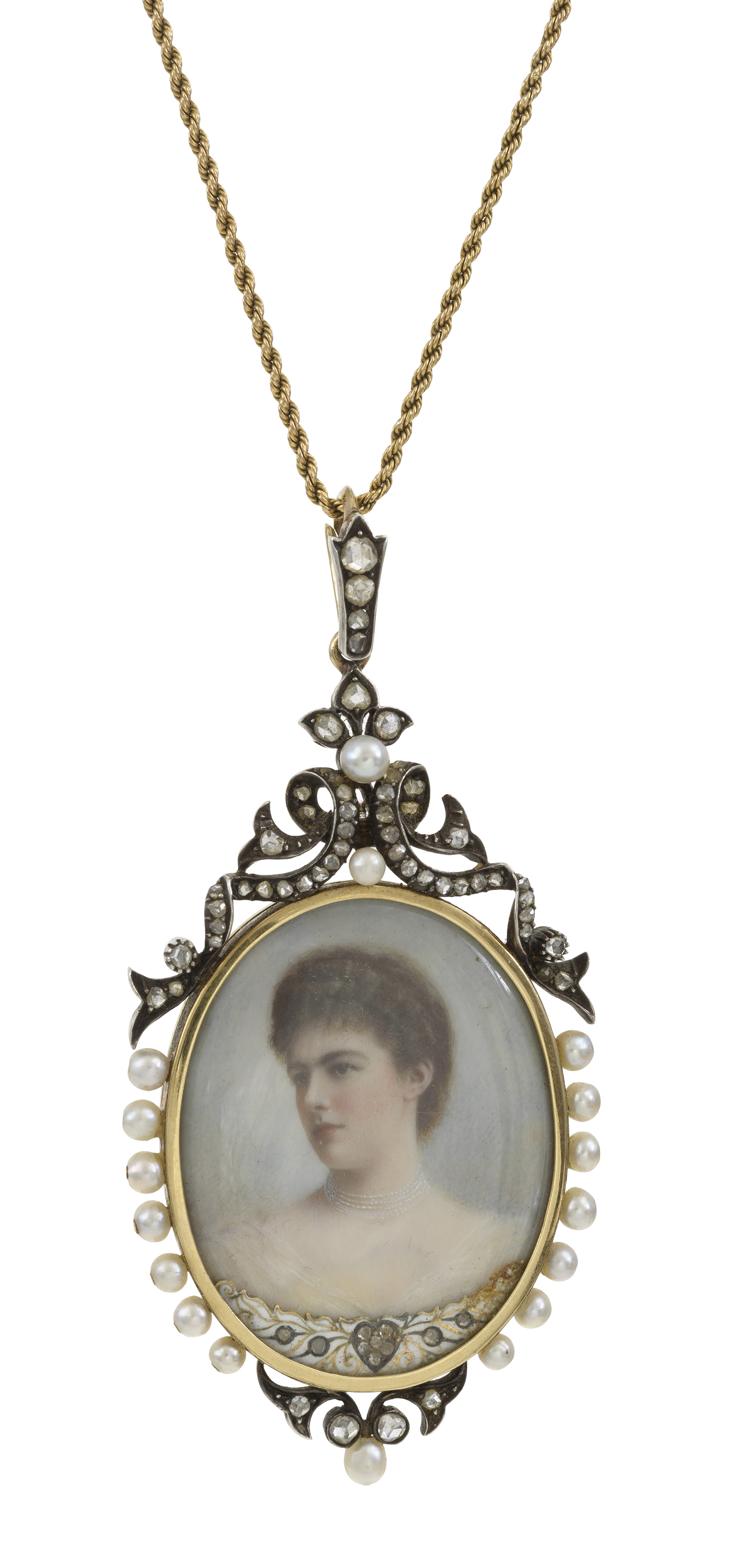 Comprising a double sided porcelain painted pendant featuring a mother and child to verso, with seed pearl and diamond decoration, mounted in 15ct gold.