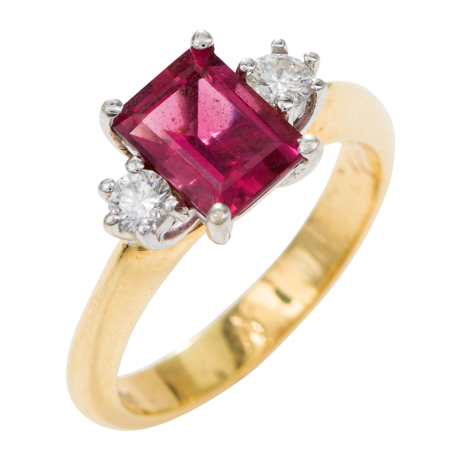 The emerald cut tourmaline of 1.66cts, with round brilliant cut diamond set shoulders, mounted in 18ct gold, ring size N.