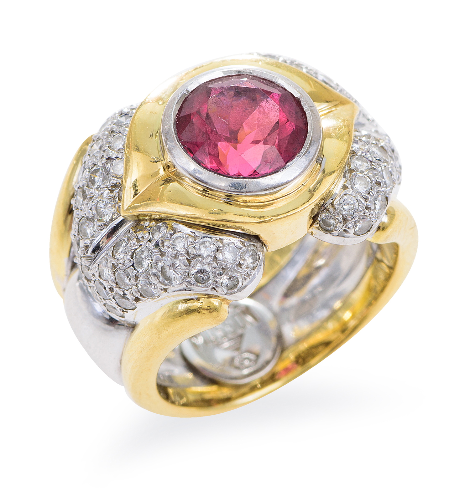 Comprising a round faceted pink tourmaline totalling 2.33cts, with diamond set shoulders totalling 1.00cts, stamped Musson, mounted in platinum and 18ct gold, ring size L.