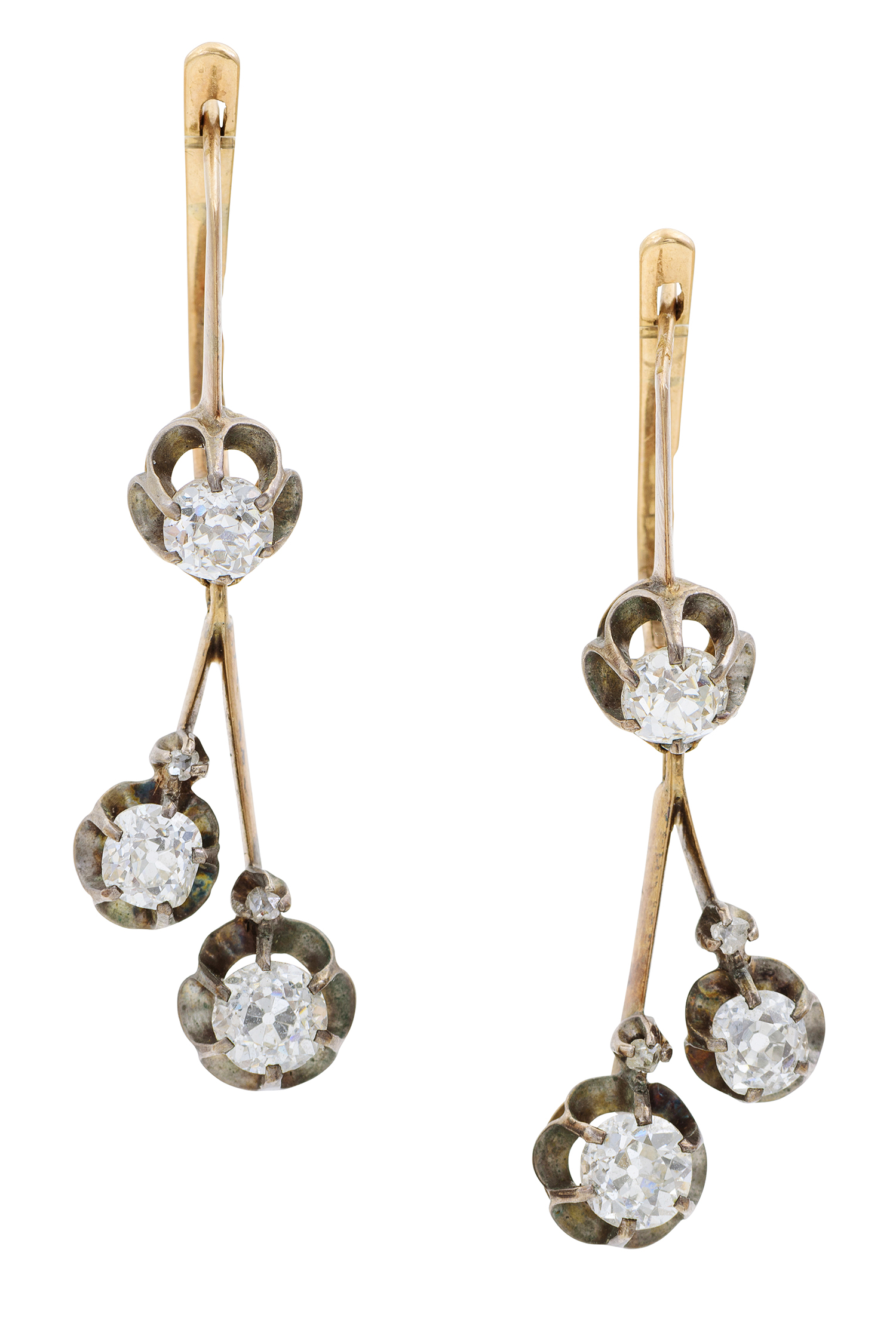 Each earring comprising an old cut diamond with two further diamonds suspended below, all totalling 0.72cts, mounted in 14ct rose gold and silver.