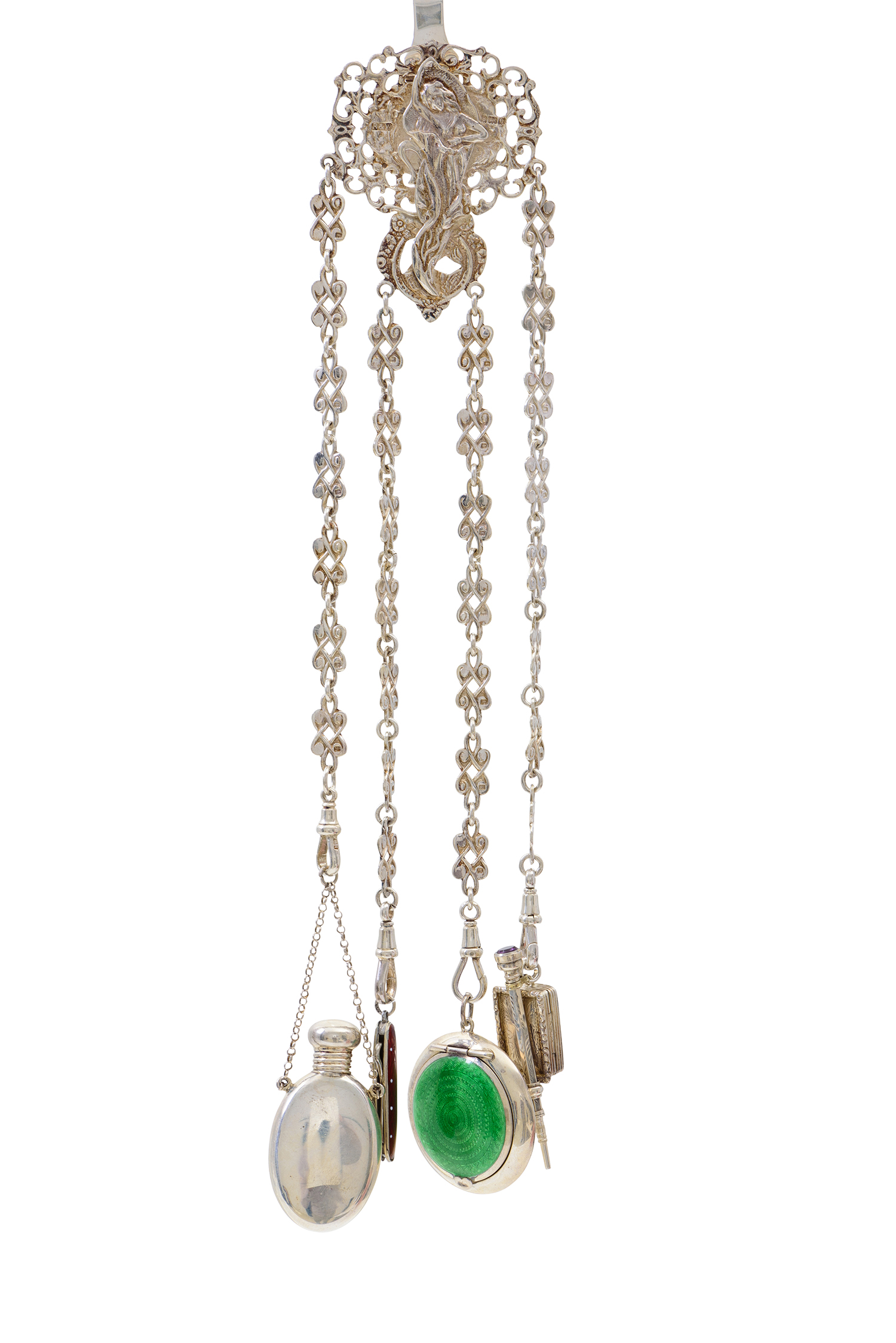 The chatelaine hallmarked London 1901, comprising a scent bottle hallmarked Birmingham 1899-1901, maker A&J, a red enamelled shoe lace hook, a green enamelled powder compact hallmarked Birmingham 1946-47, a vinaigrette hallmarked Birmingham1832-33, maker WP and amethyst set propelling pencil.