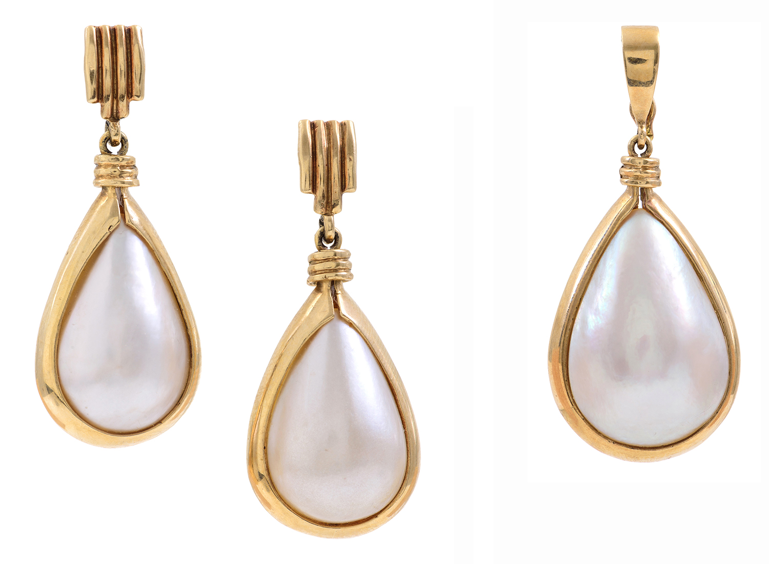 Comprising a pendant and a pair of earrings, the pear shaped mabe pearls, mounted in gold.