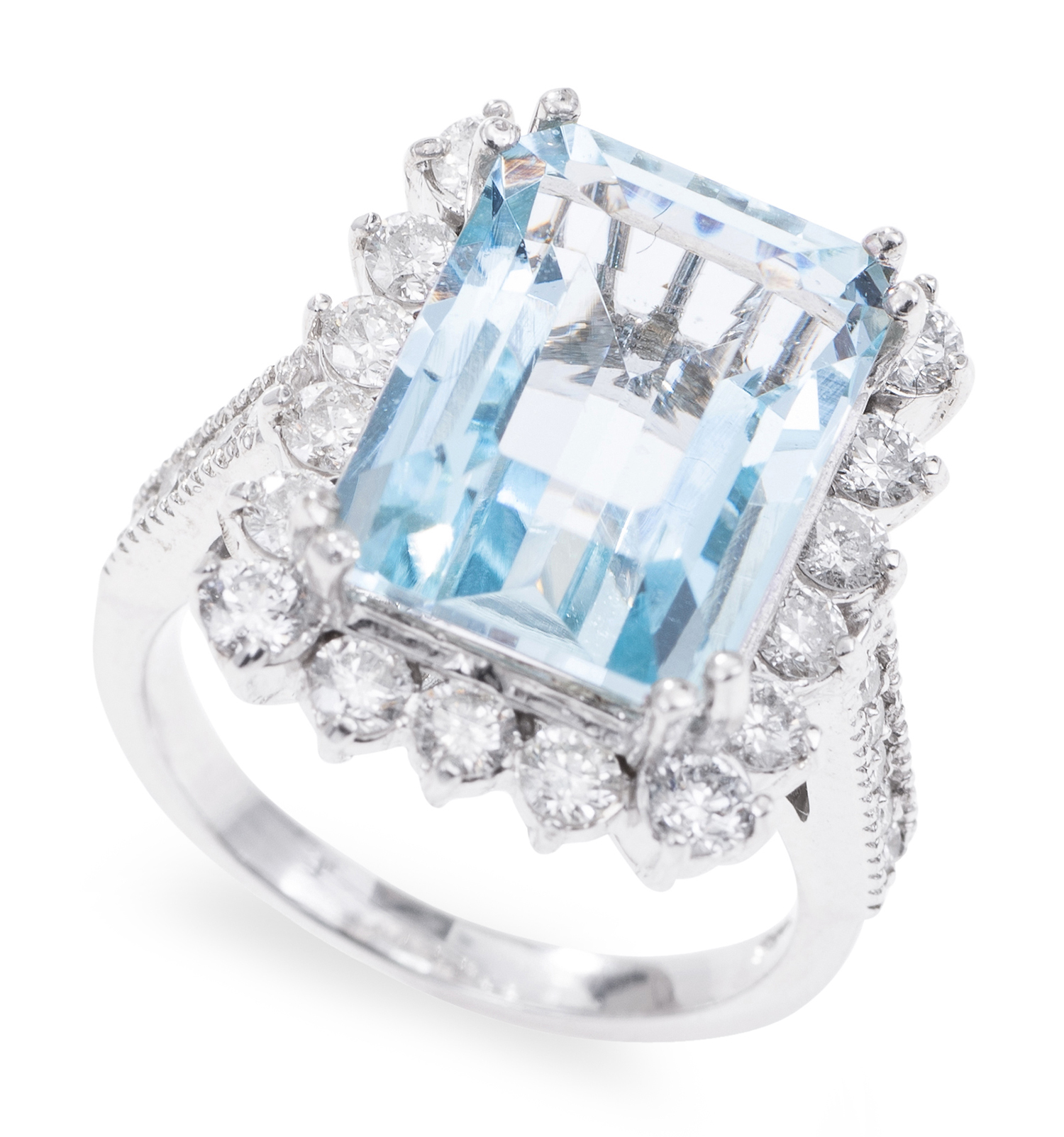 Centrally set with an emerald cut aquamarine of 7.00cts, surrounded and shouldered by round brilliant cut diamonds totalling 1.25cts, mounted in 14ct white gold, ring size N.