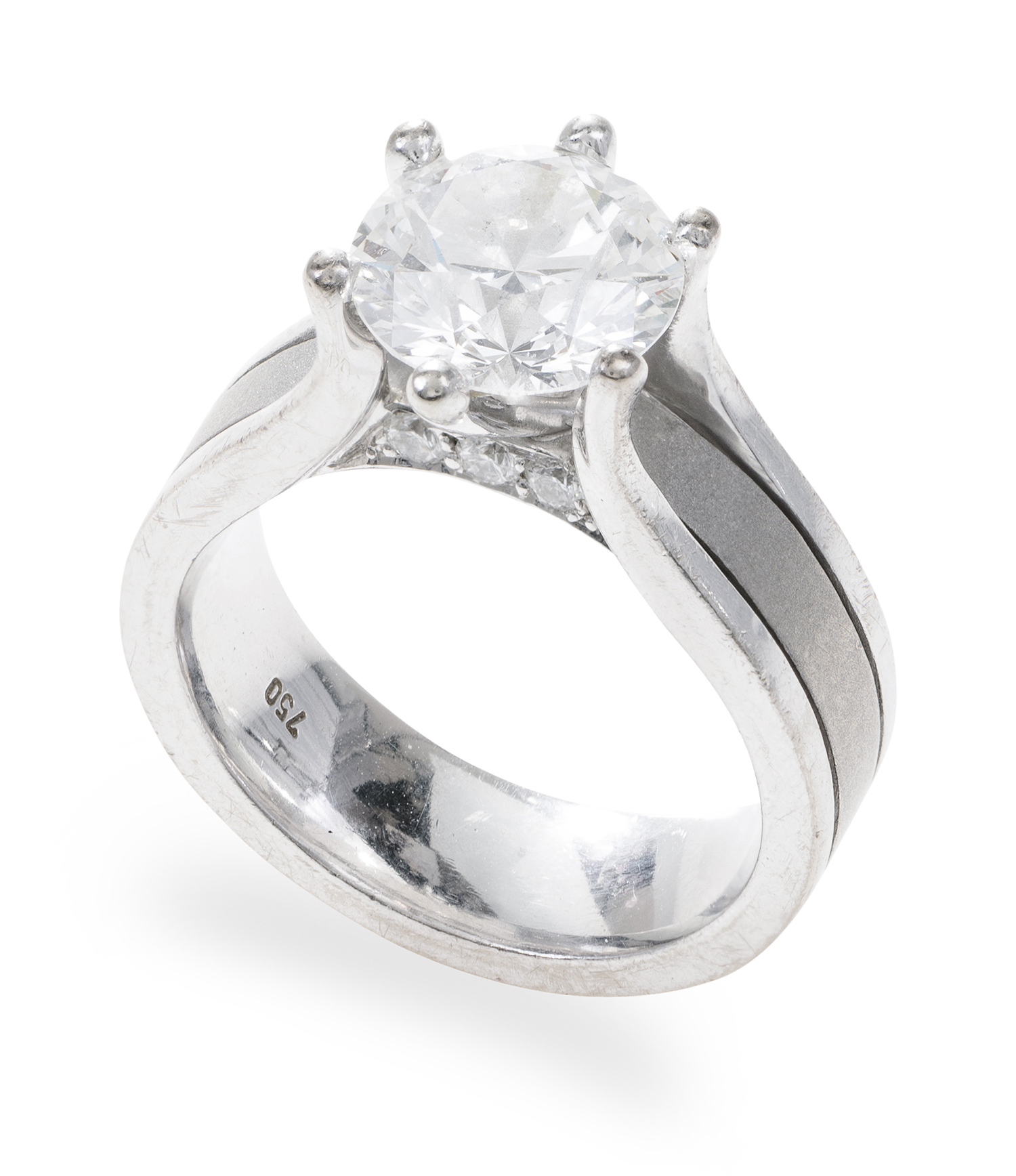 The round brilliant cut diamond of 2.94cts, with diamond detail to the bridge, hand crafted in 18ct white gold, accompanied by GIA diamond grading report number 14172268 stating colour E and clarity VS2.