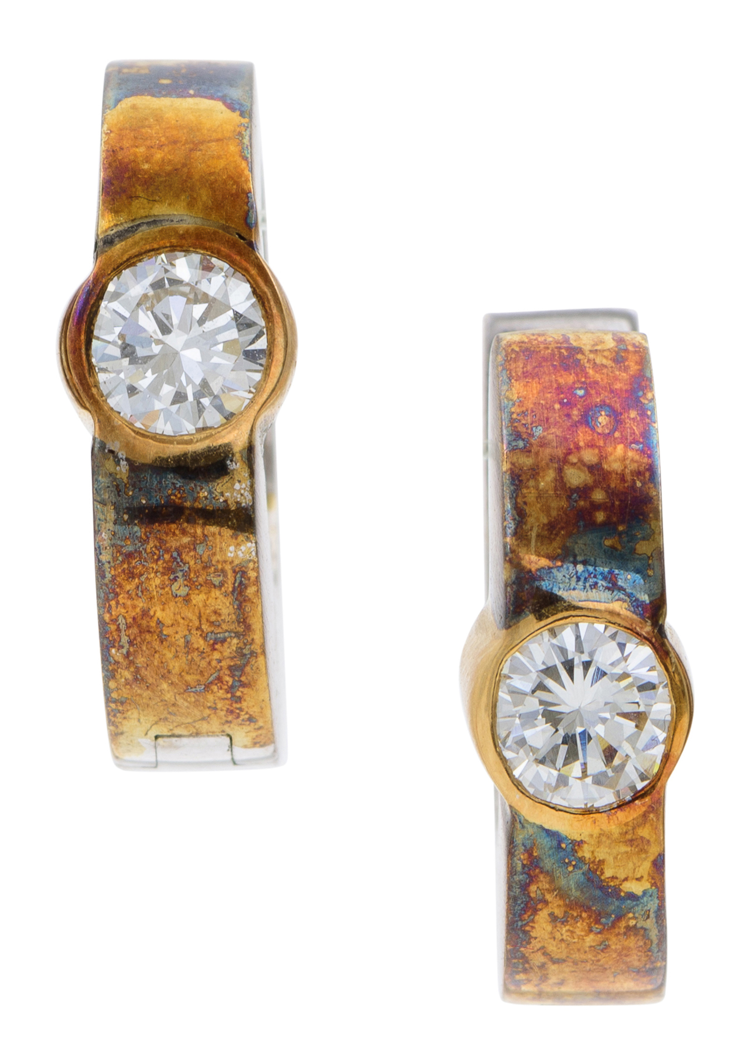 The earrings present in good condition. Minor marks. Natural oxidation to gold. Diamonds graded as colour H and clarity VS-SI. Two tone 9ct gold.