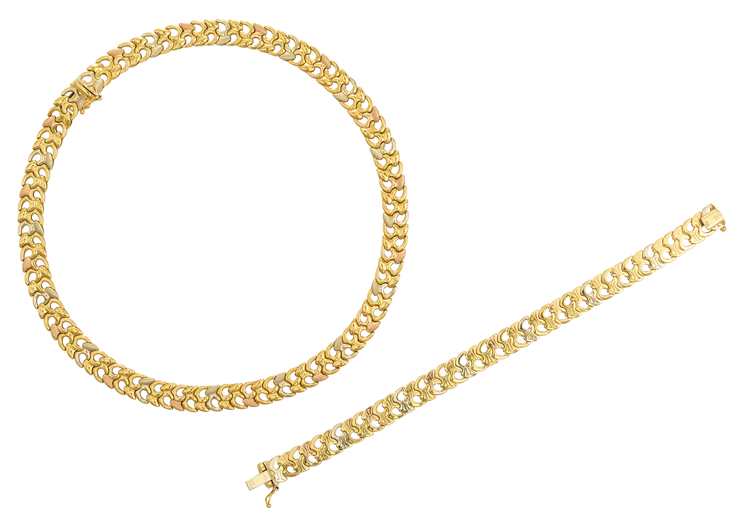 Comprising a fancy link necklace with conforming bracelet, total length 180mm, crafted in 18ct tri-coloured gold, total length 410mm.