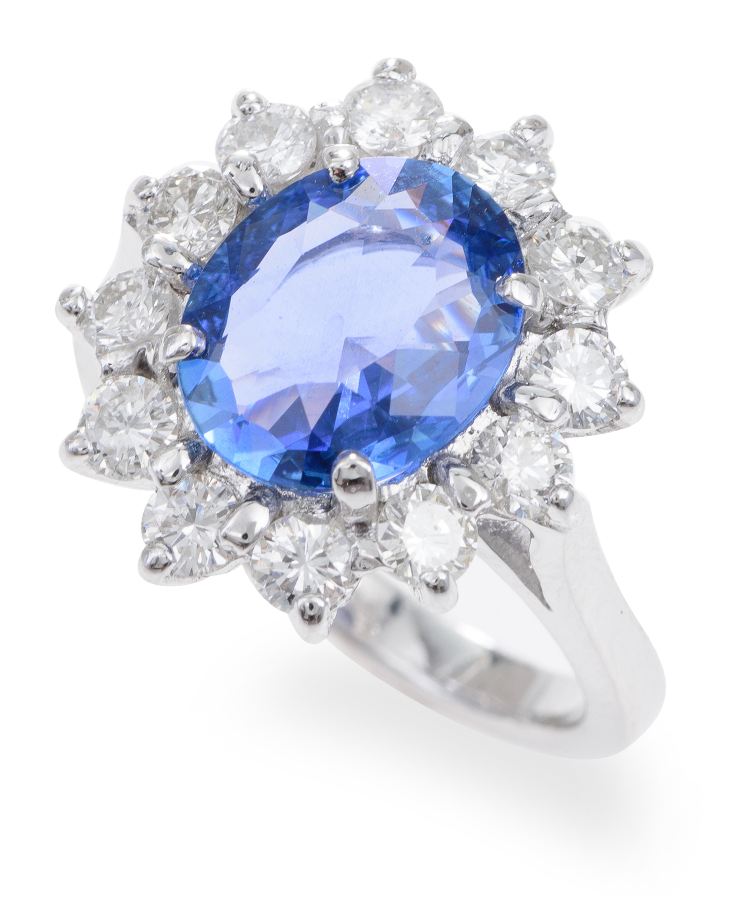 Comprising an oval cut Ceylonese sapphire of 3.00cts, surrounded by a border of round brilliant cut diamonds totalling 1.40cts, mounted in 18ct white gold, ring size M.