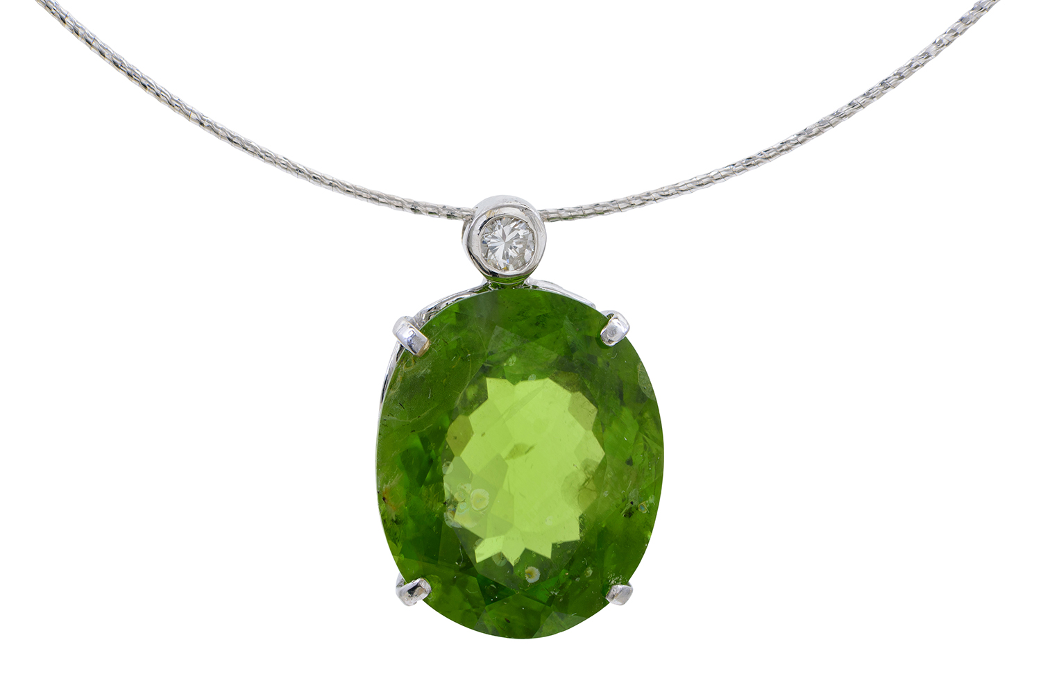Comprising an oval cut peridot of 21.50cts, surmounted by a round brilliant cut diamond bale totalling 0.10cts, suspended on an 18ct white gold omega chain.