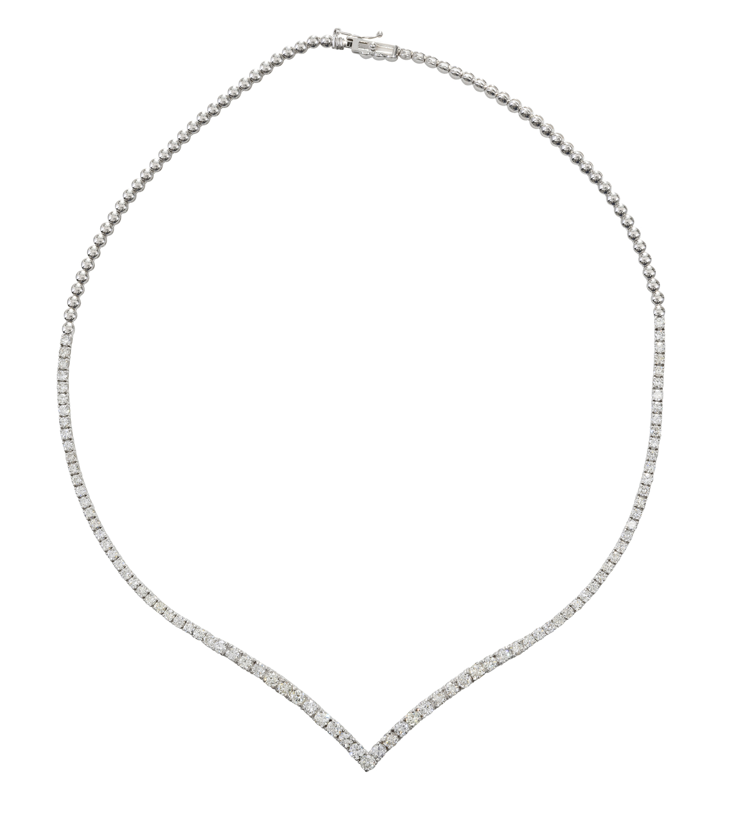 Set with round brilliant cut diamonds totalling 7.60cts, styled in a 'V' shape, mounted in 18ct white gold, total length 440mm.