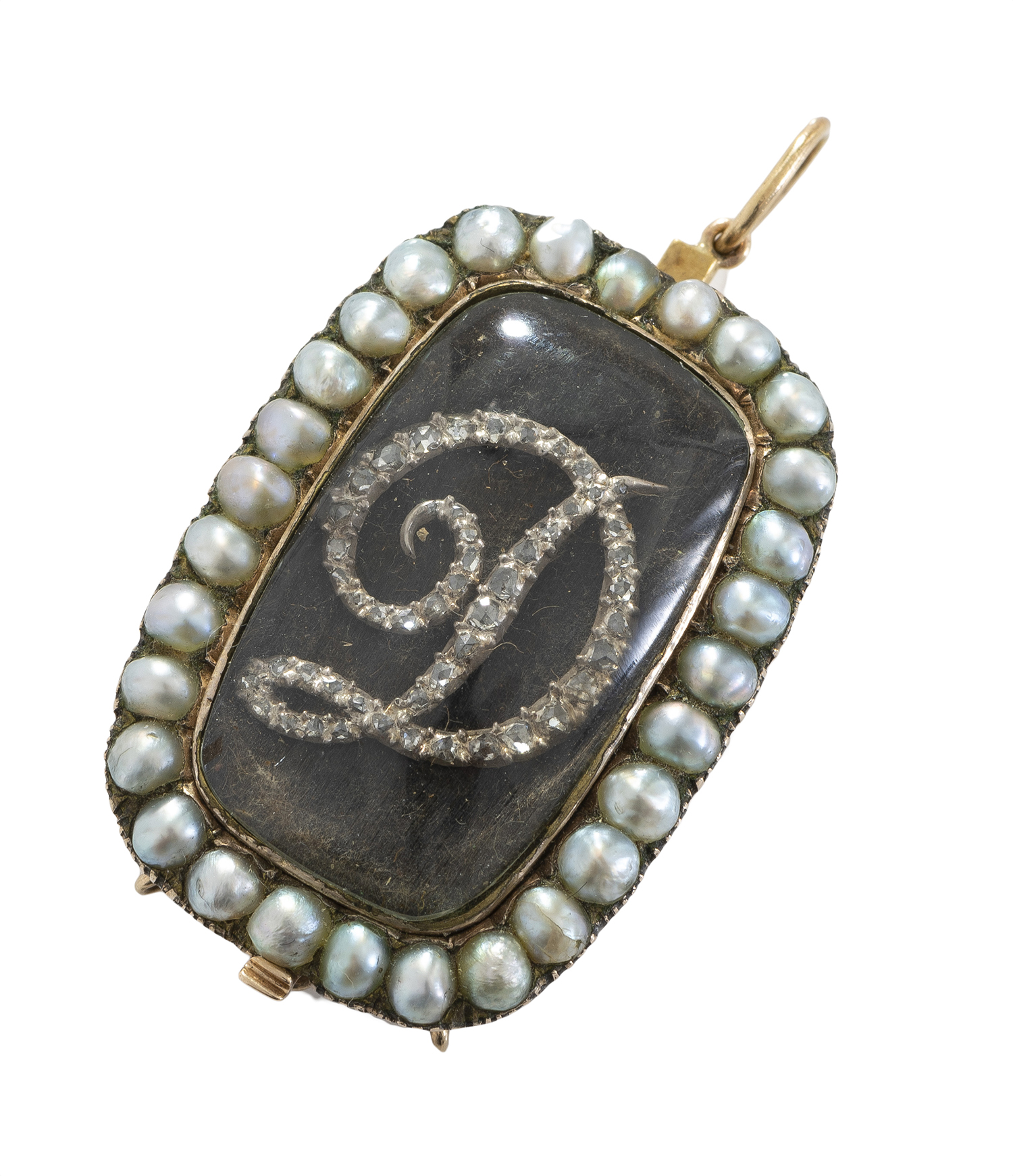 The glazed hair locket with a diamond set "D", within a pearl surround, mounted in gold.