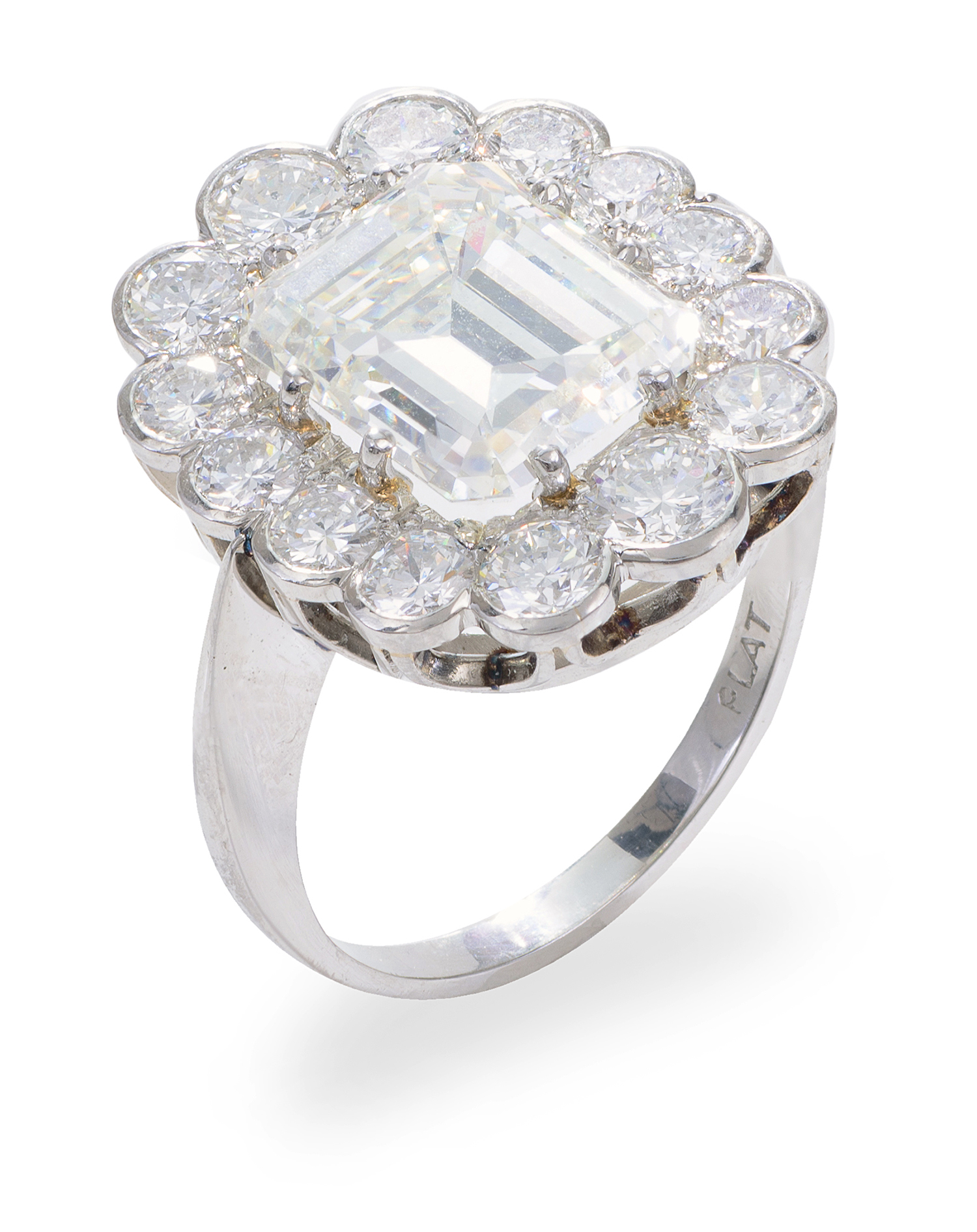 Centrally set with an emerald cut diamond of 4.80cts, surrounded by round brilliant cut diamonds totalling 2.26cts, mounted in platinum, ring size O.