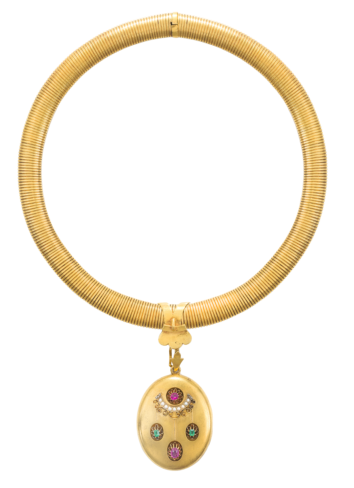 The locket set with faceted rubies, emeralds, diamonds and seed pearls, suspended from an original flexible collar with concealed clasp, all crafted in 15ct gold.