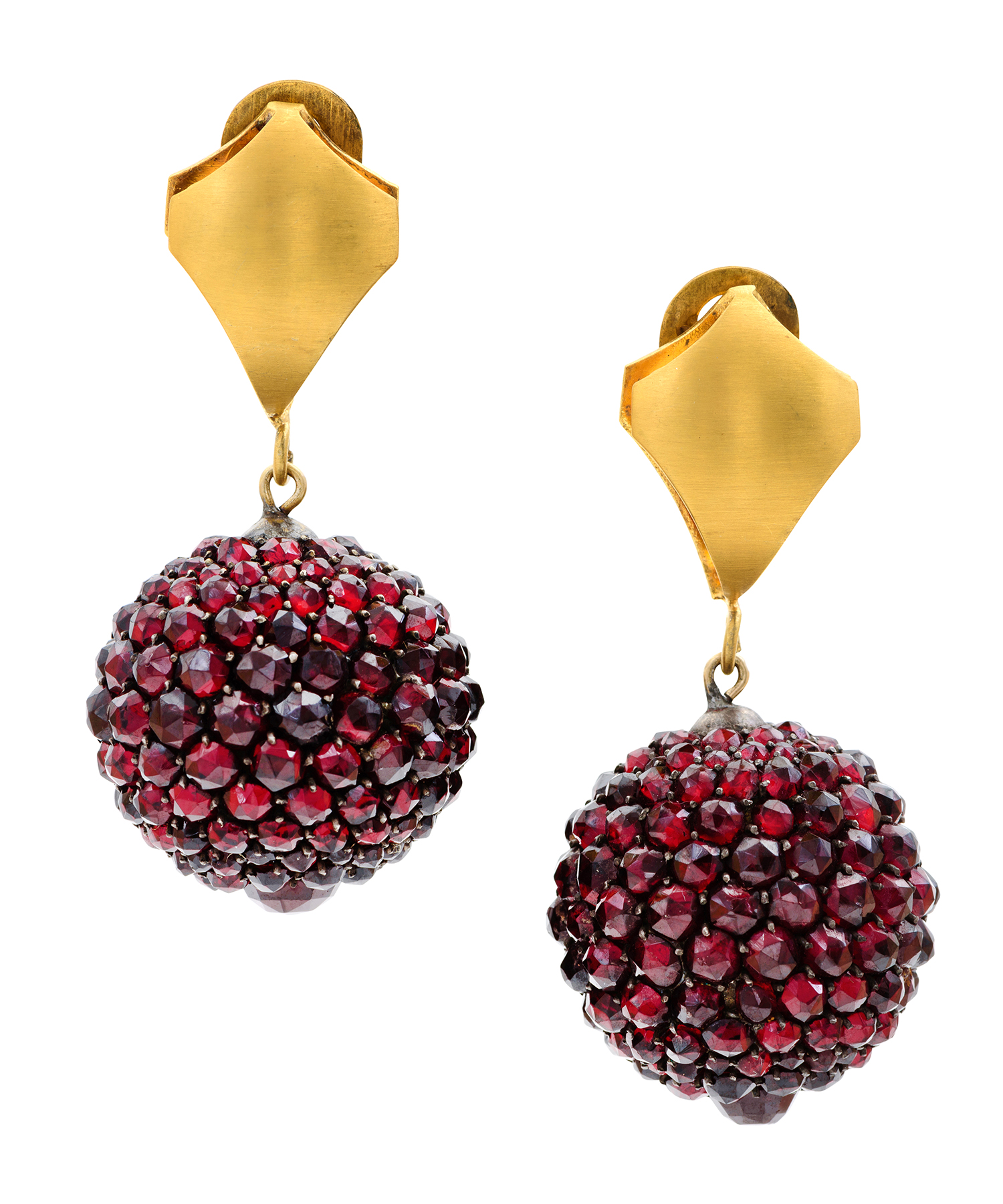 Garnet set ball drops, suspended from silver gilt fittings.