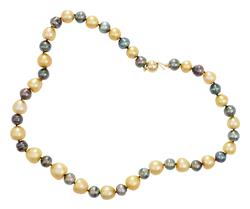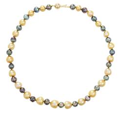 Comprising graduated baroque golden South Sea pearls and Tahitian pearls measuring 9.0mm to 13.0mm, to a gold ball clasp, total length 500mm.