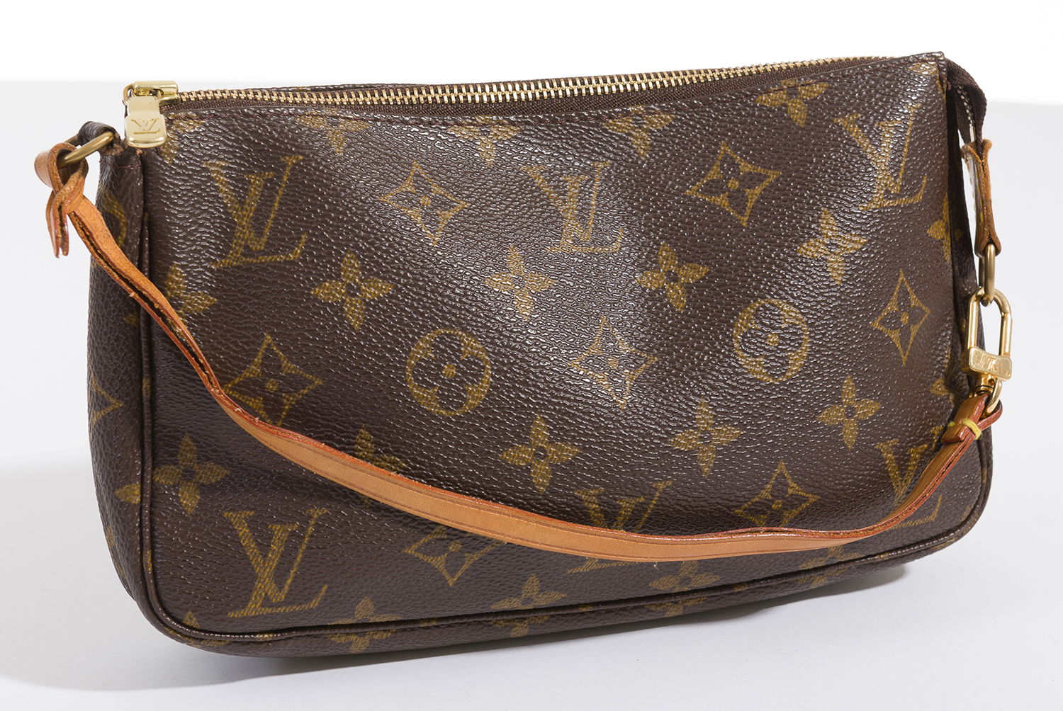 Styled in monogram canvas with tan leather trim and gold metal hardware, M51980, 13 x 21cm.