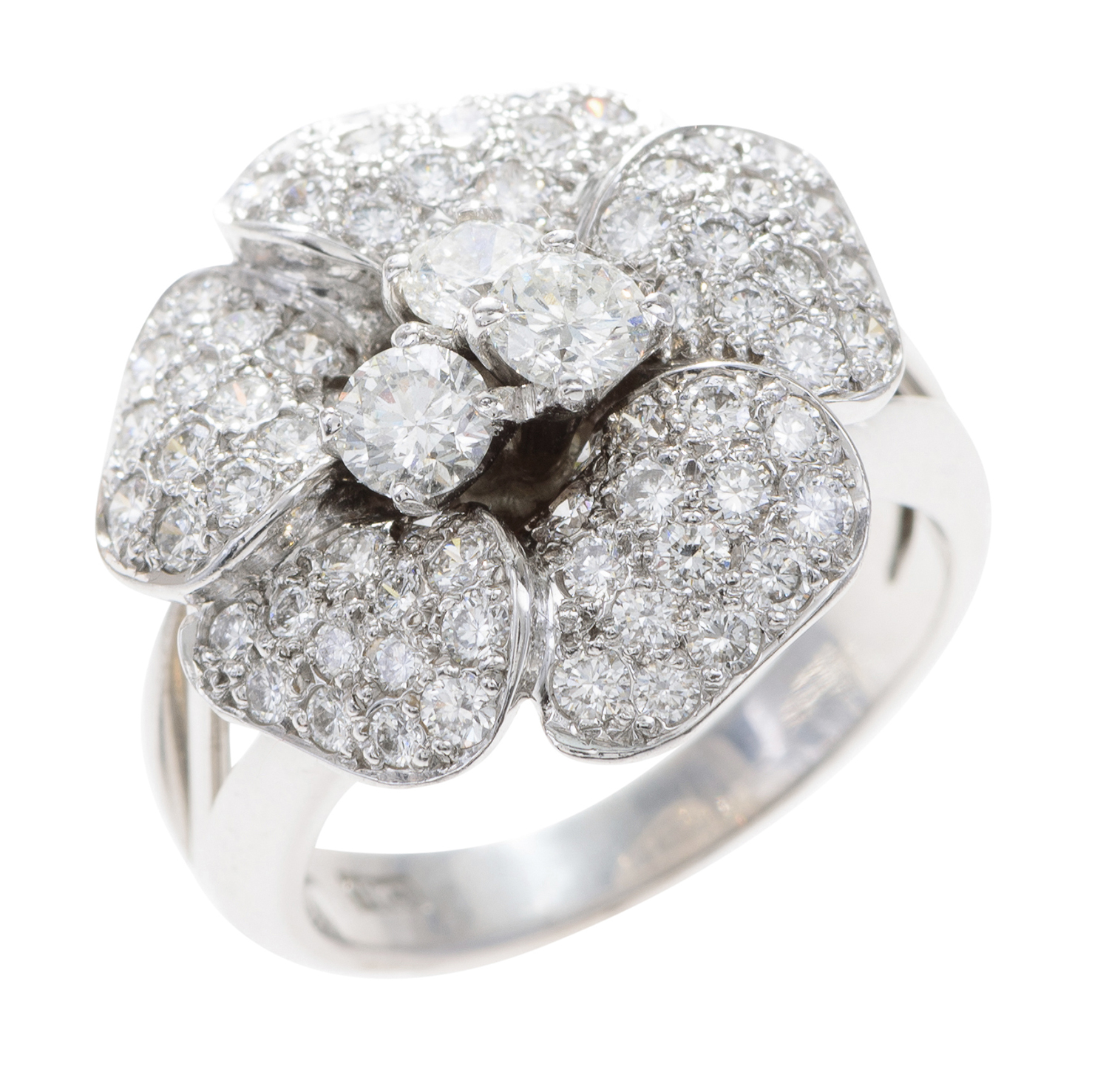 Comprising three round brilliant cut diamonds totalling 0.56cts as stamen, with pave set diamond petals totalling 1.30cts, mounted in 18ct white gold, ring size L.