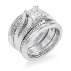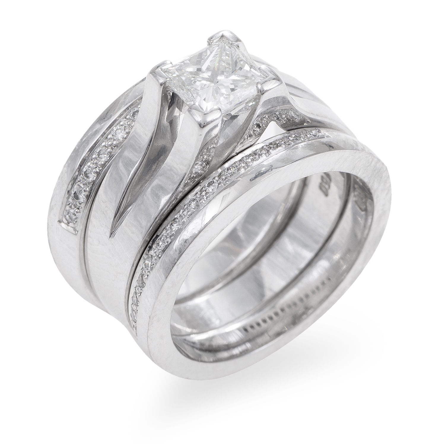 The princess cut diamond of 0.83cts, mounted in 18ct white gold, ring size K, accompanied by two conforming half circle diamond set bands, principal stone accompanied by an HRD report number 20043834916, stating colour H and clarity VS1.