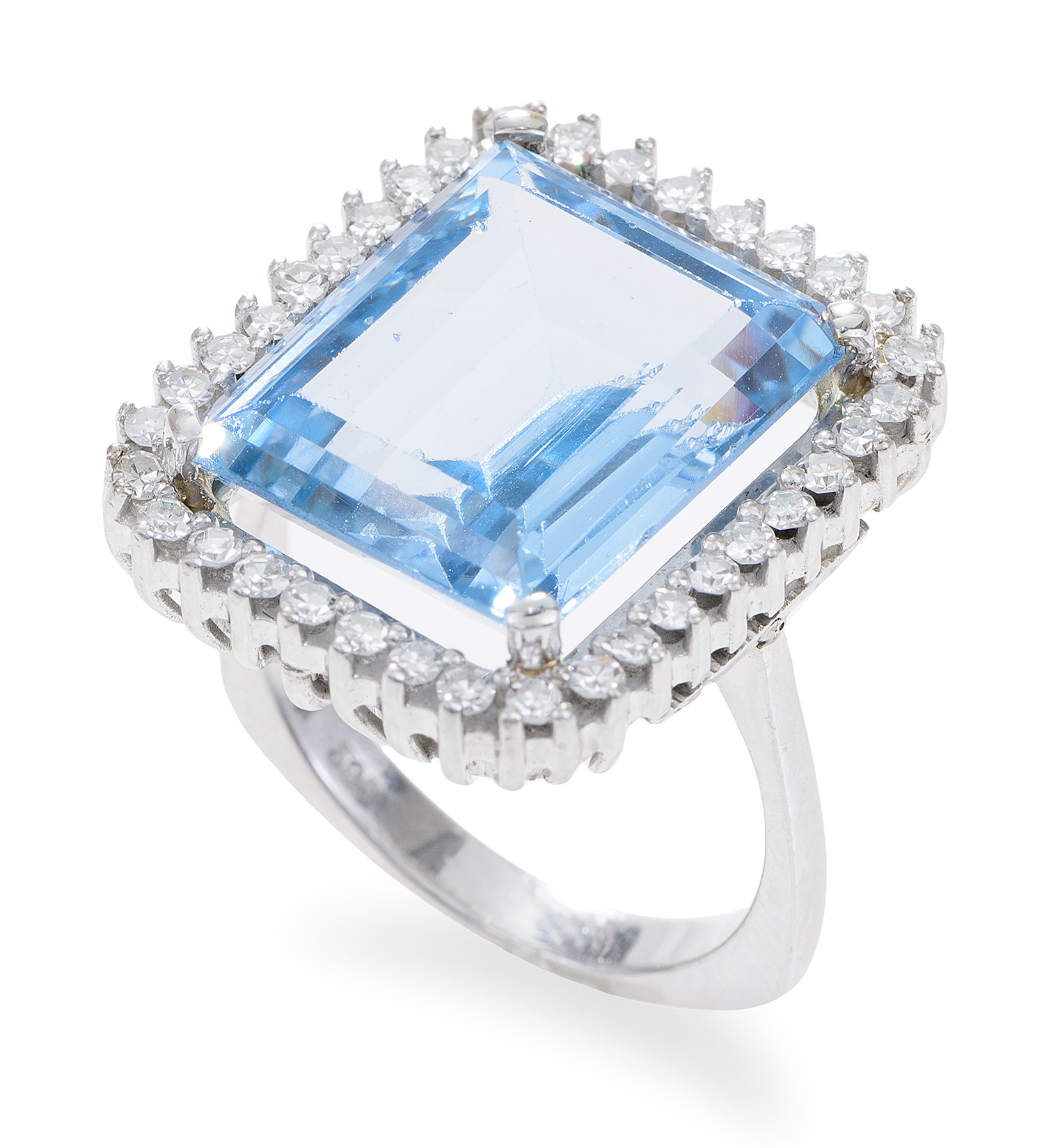 Comprising a rectangular aquamarine of 11.00cts, surrounded by thirty six round brilliant cut diamonds totalling 0.50cts, mounted in 14ct white gold, ring size Q.