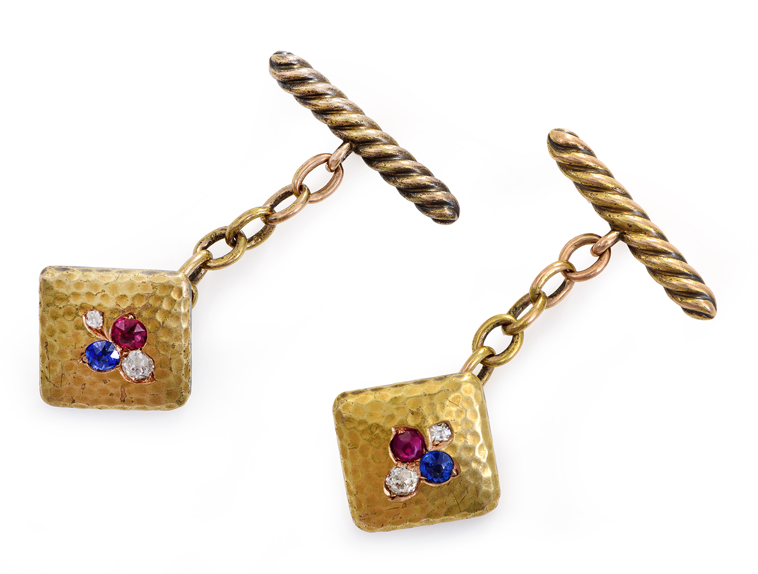 The hammered gold plaques set with diamonds, ruby and sapphire, twisted gold bar backing, mounted in 14ct gold.