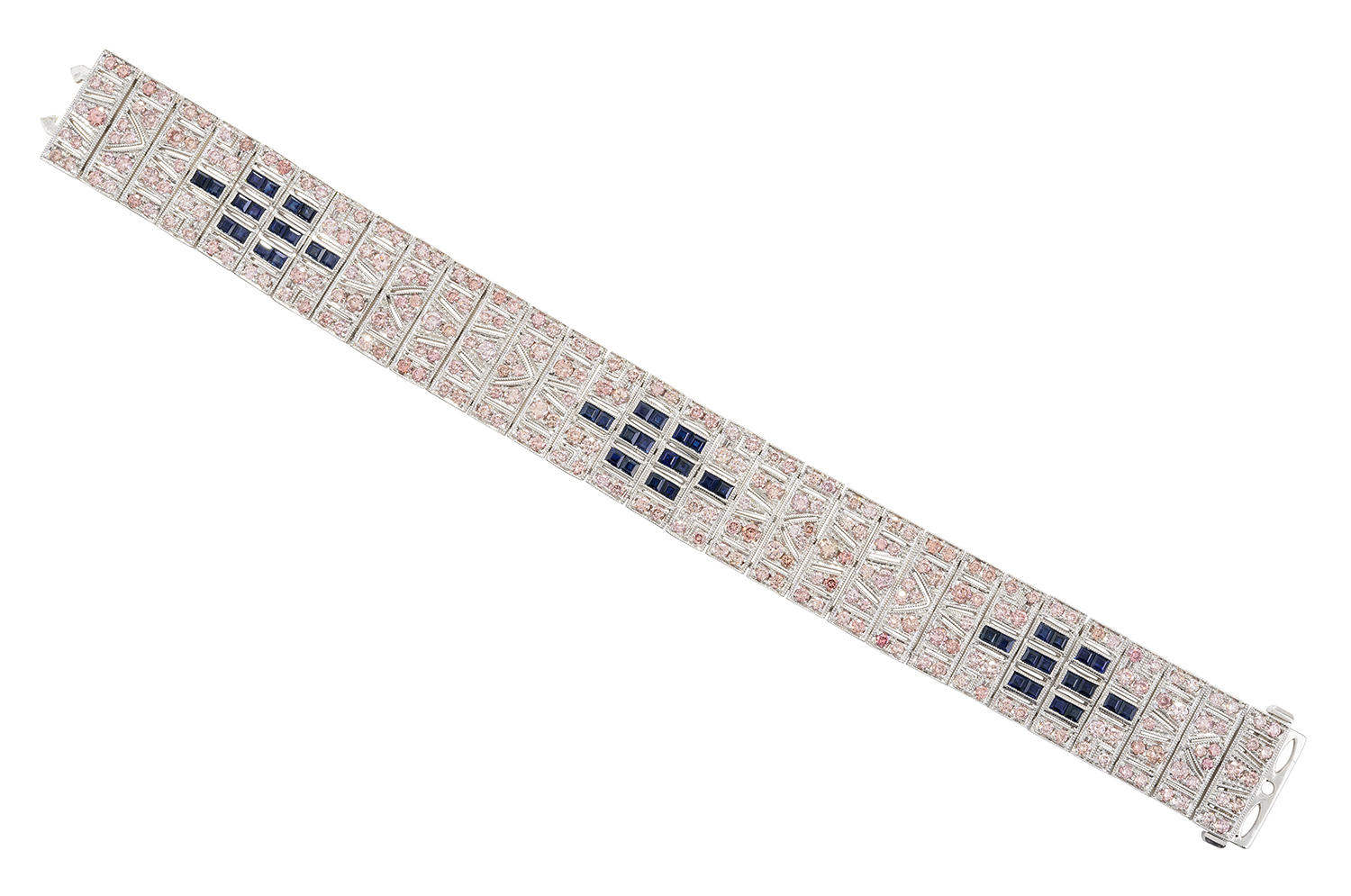 Featuring articulated panels, grain set with round brilliant cut pink diamonds totalling 7.56cts, having feature square faceted sapphires totalling 4.82cts, mounted in 18ct white gold, total length 180mm.